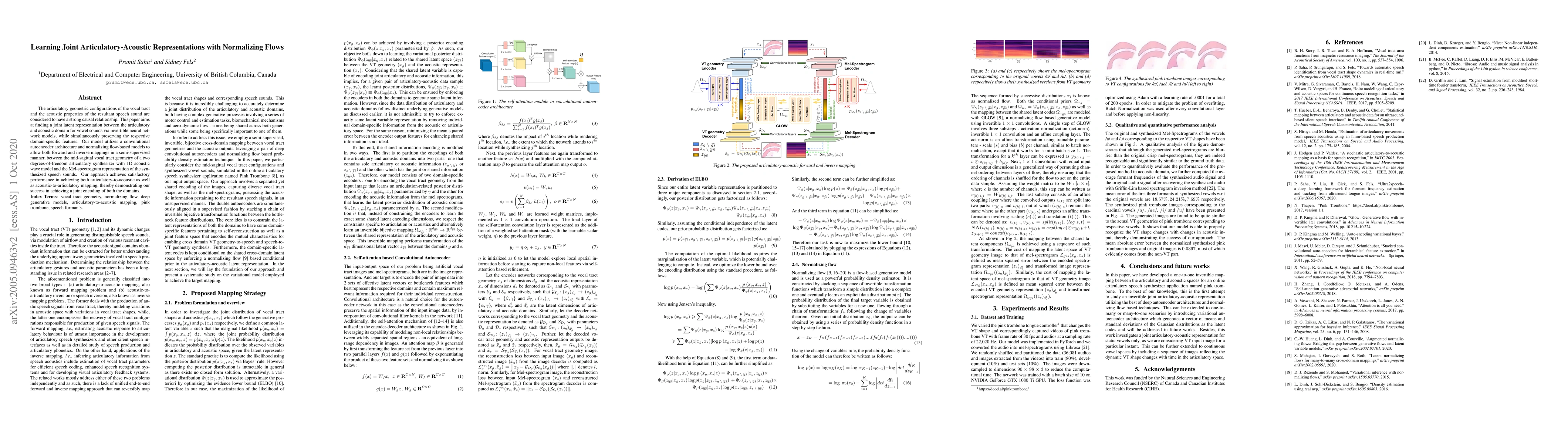 This paper proposes a joint latent representation model using normalizing flows and convolutional autoencoders to map articulatory vocal tract configurations to acoustic speech sounds and vice versa, achieving effective bidirectional mappings between the two domains. The model demonstrates successful joint encoding of articulatory and acoustic features.