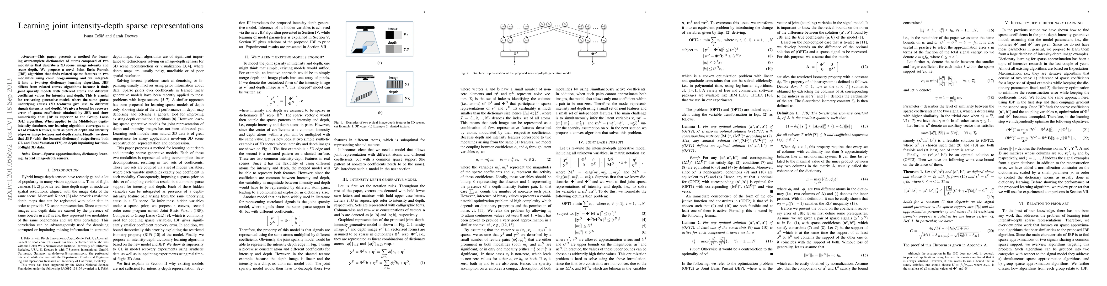 This paper introduces a Joint Basis Pursuit (JBP) algorithm for learning overcomplete dictionaries that represent both image intensity and scene depth, achieving superior performance compared to the Group Lasso method. The JBP algorithm finds joint sparsity models with different atoms and coefficients, crucial for recovering generative models of 3D features.