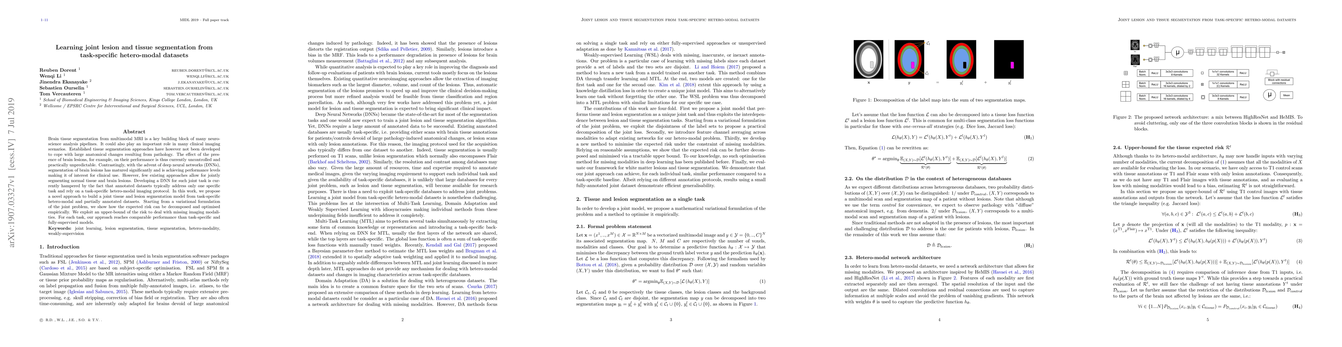 This paper proposes a novel deep neural network approach to jointly segment brain tissue and lesions from multimodal MRI datasets that are task-specific and partially annotated. The method decomposes and optimizes the expected risk using a variational formulation, effectively handling missing imaging modalities and achieving performance comparable to task-specific and fully-supervised models.