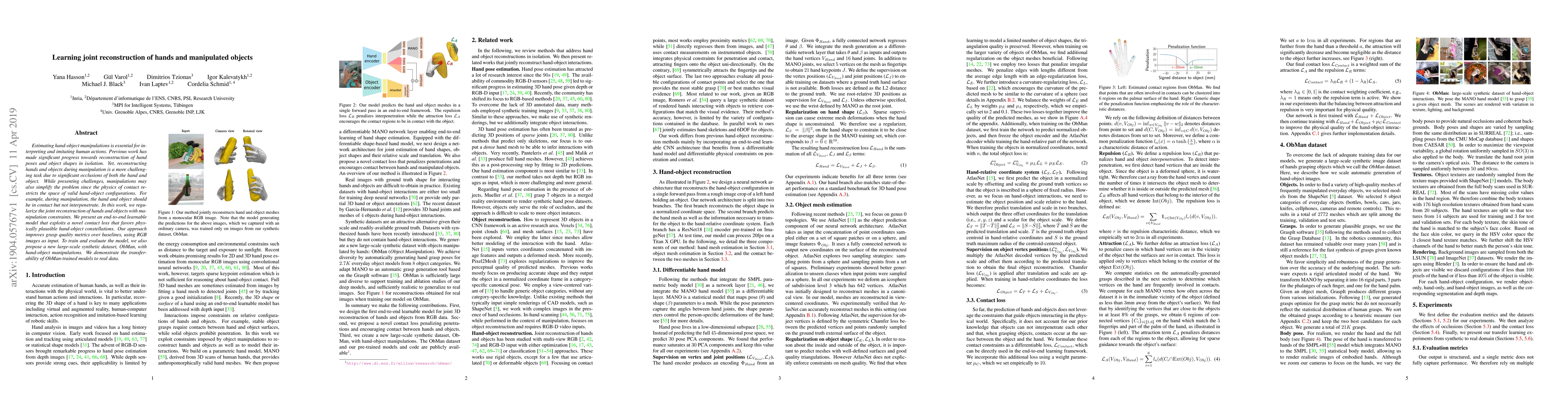 Estimating hand-object manipulations is essential for interpreting and imitating human actions. Previous work has made significant progress towards reconstruction of hand poses and object shapes in isolation. Yet, reconstructing hands and objects during manipulation is a more challenging task due to significant occlusions of both the hand and object. While presenting challenges, manipulations may also simplify the problem since the physics of contact restricts the space of valid hand-object configurations. For example, during manipulation, the hand and object should be in contact but not interpenetrate. In this work, we regularize the joint reconstruction of hands and objects with manipulation constraints. We present an end-to-end learnable model that exploits a novel contact loss that favors physically plausible hand-object constellations. Our approach improves grasp quality metrics over baselines, using RGB images as input. To train and evaluate the model, we also propose a new large-scale synthetic dataset, ObMan, with hand-object manipulations. We demonstrate the transferability of ObMan-trained models to real data.