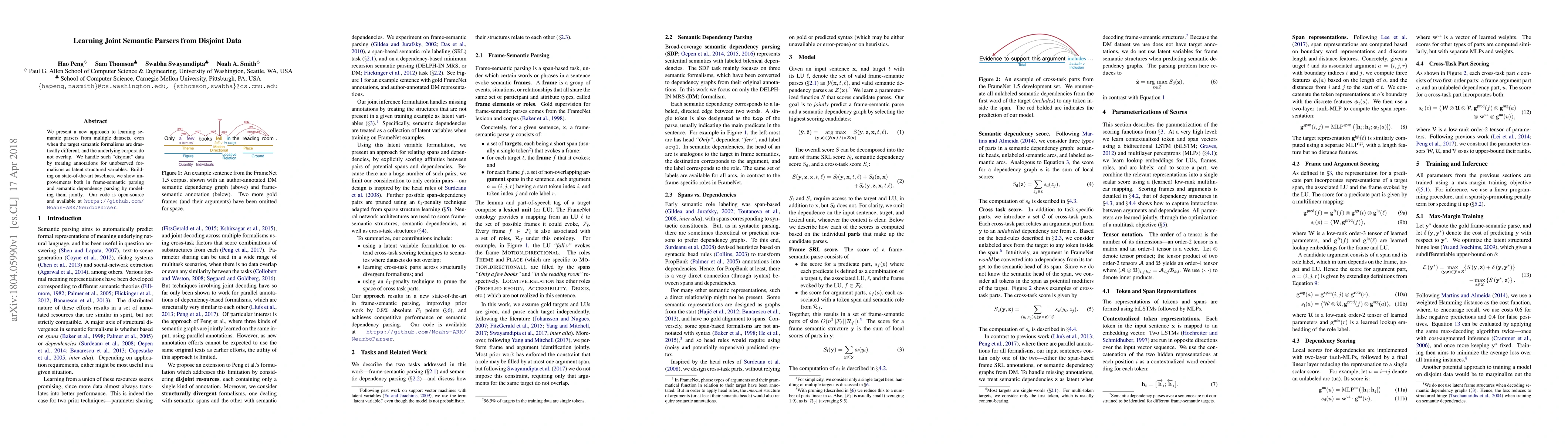 This paper introduces a method for learning semantic parsers from non-overlapping datasets with different semantic formalisms by treating unobserved annotations as latent variables, achieving better joint performance in frame-semantic and semantic dependency parsing.