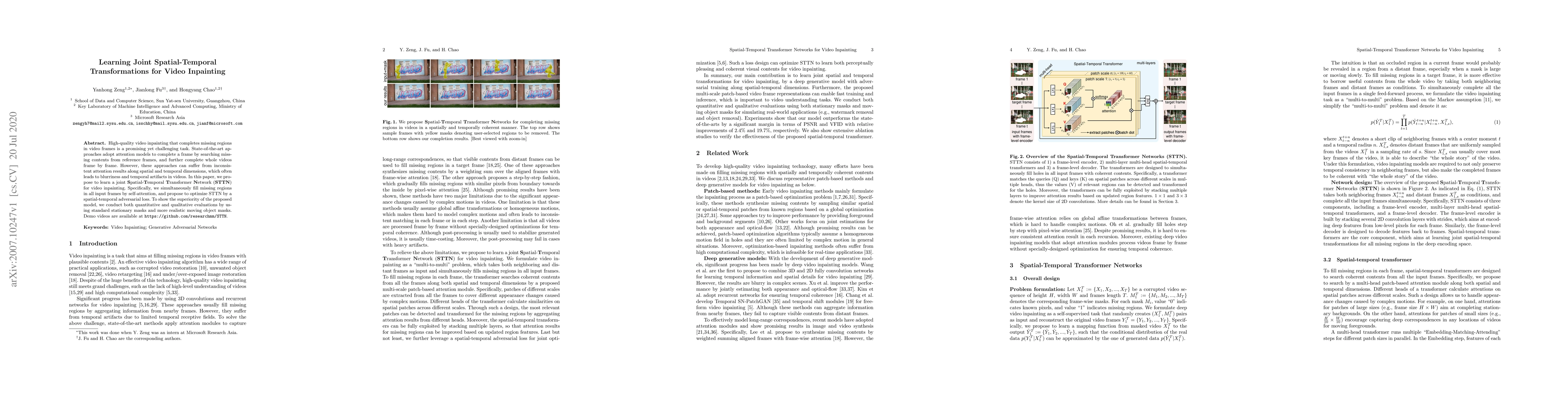 This paper proposes a Spatial-Temporal Transformer Network (STTN) to improve video inpainting by jointly addressing spatial and temporal inconsistencies. The model uses self-attention to fill missing regions across frames and optimizes with a spatial-temporal adversarial loss, demonstrating superior performance in both quantitative and qualitative evaluations.