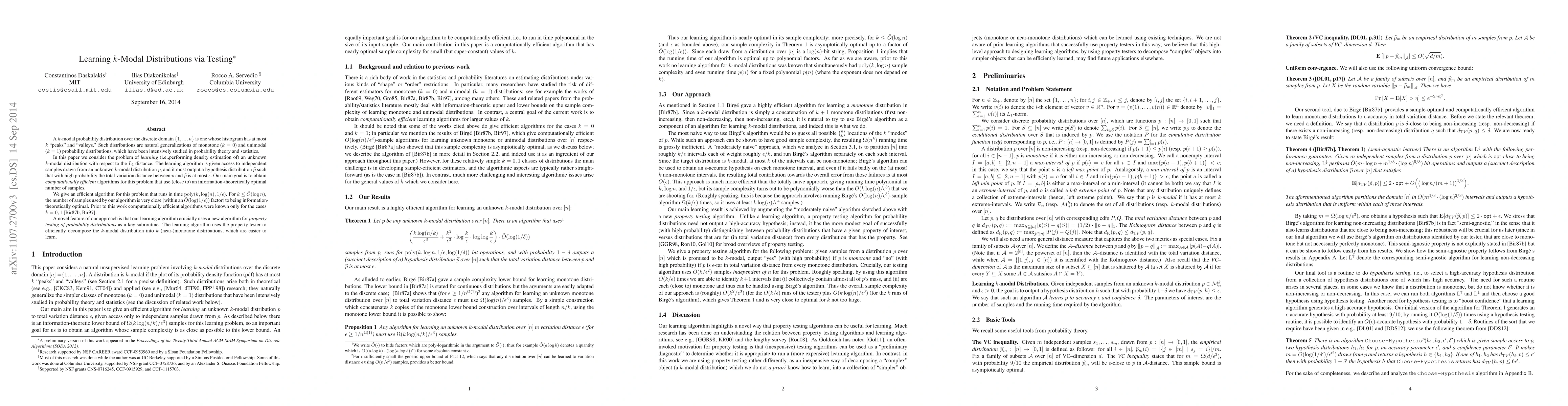 This paper presents an efficient algorithm for learning $k$-modal distributions using a minimal number of samples, running in polynomial time. The key innovation is employing a property testing algorithm to decompose the $k$-modal distribution into simpler (near-)monotone distributions, facilitating density estimation.