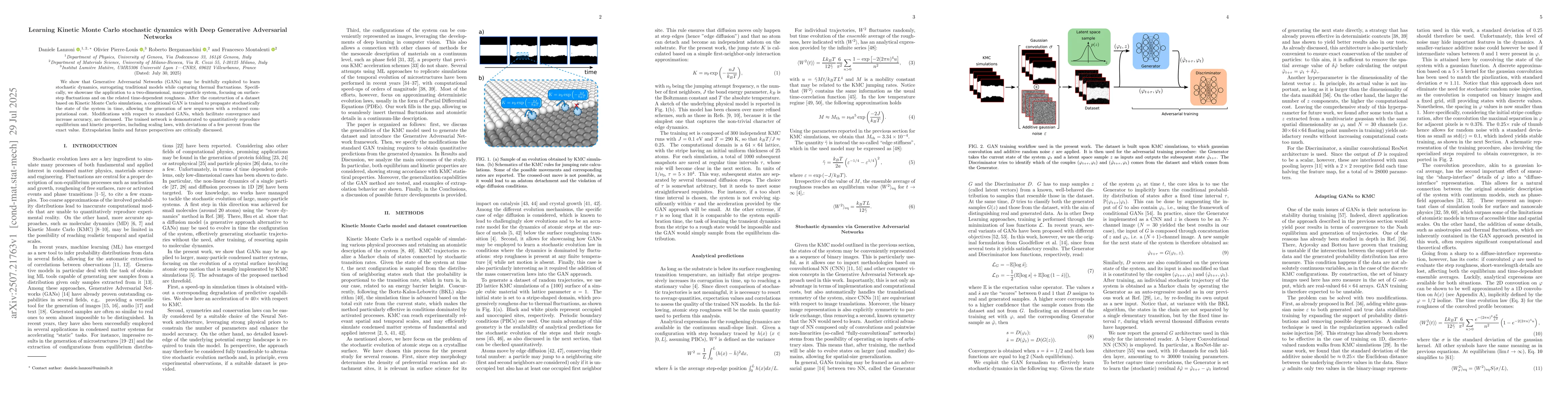 The research employs Generative Adversarial Networks (GANs) to learn stochastic dynamics of a two-dimensional, many-particle system, focusing on surface-step fluctuations and related time-dependent roughness. A dataset is constructed based on Kinetic Monte Carlo (KMC) simulations, and a conditional GAN is trained to propagate the system's state stochastically in time, generating new sequences with reduced computational cost.
