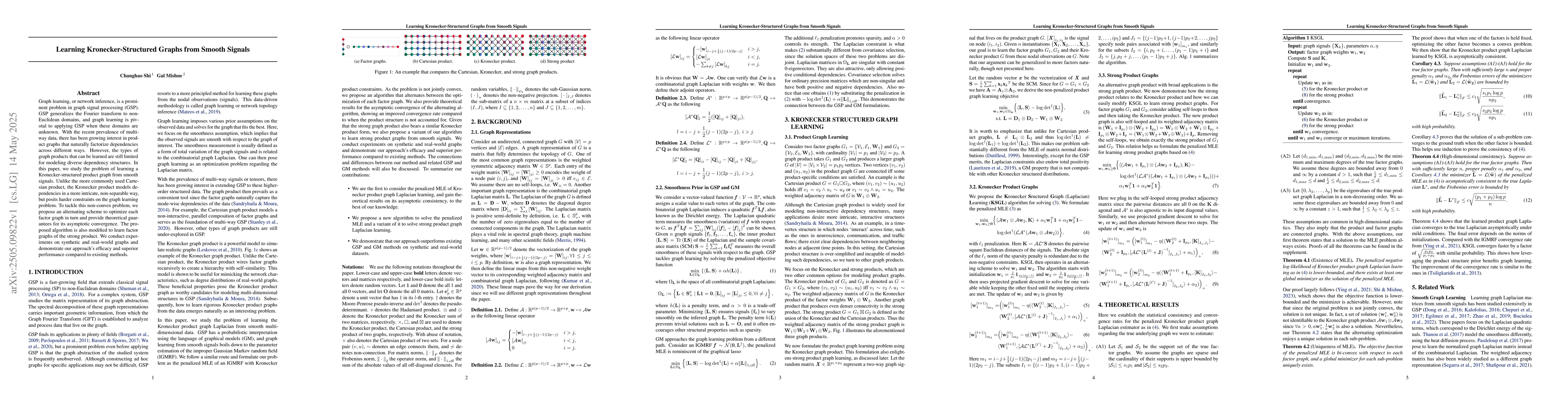 The paper proposes an alternating scheme to optimize each factor graph for learning Kronecker-structured product graphs from smooth signals, providing theoretical guarantees for its asymptotic convergence. The algorithm is also modified to learn factor graphs of the strong product.