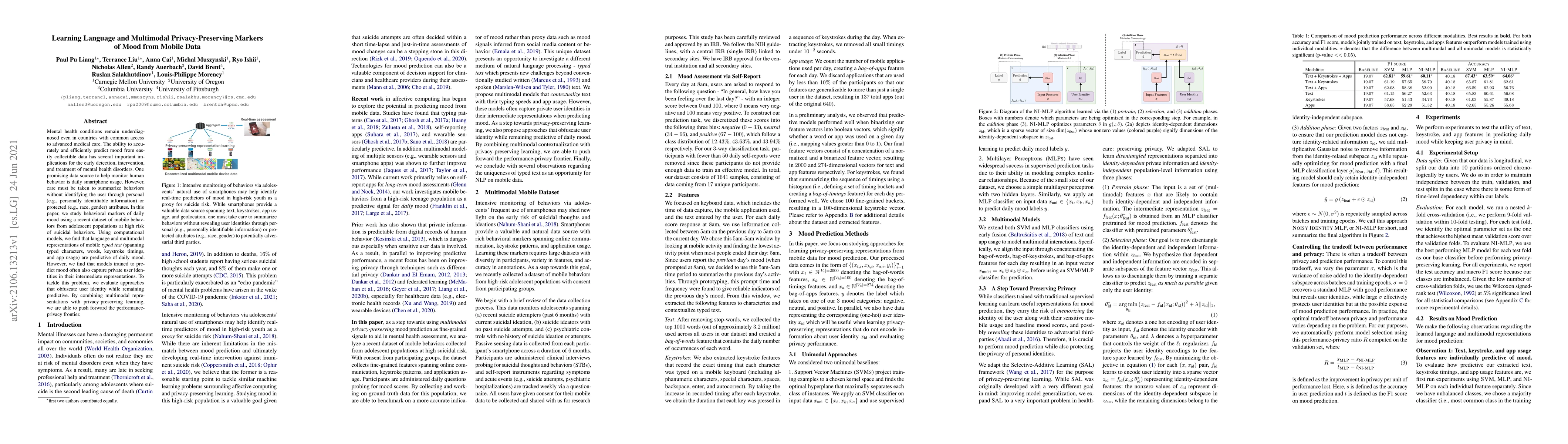 Mental health conditions remain underdiagnosed even in countries with common access to advanced medical care. The ability to accurately and efficiently predict mood from easily collectible data has several important implications for the early detection, intervention, and treatment of mental health disorders. One promising data source to help monitor human behavior is daily smartphone usage. However, care must be taken to summarize behaviors without identifying the user through personal (e.g., personally identifiable information) or protected (e.g., race, gender) attributes. In this paper, we study behavioral markers of daily mood using a recent dataset of mobile behaviors from adolescent populations at high risk of suicidal behaviors. Using computational models, we find that language and multimodal representations of mobile typed text (spanning typed characters, words, keystroke timings, and app usage) are predictive of daily mood. However, we find that models trained to predict mood often also capture private user identities in their intermediate representations. To tackle this problem, we evaluate approaches that obfuscate user identity while remaining predictive. By combining multimodal representations with privacy-preserving learning, we are able to push forward the performance-privacy frontier.