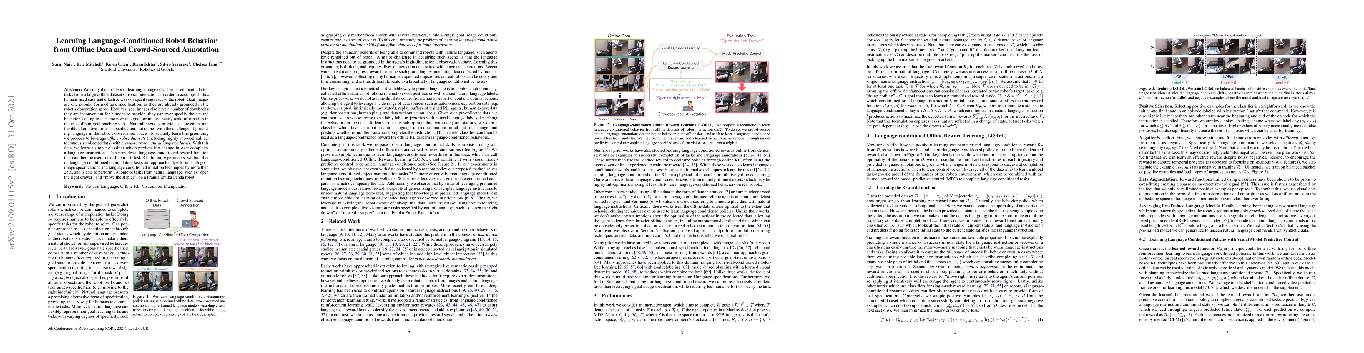 This paper proposes a method to learn robot manipulation tasks from offline data and crowd-sourced natural language annotations, achieving better performance than goal-image specifications and language-conditioned imitation techniques. The approach uses a classifier to ground language in the robot's observation space, enabling successful visuomotor tasks from natural language instructions.