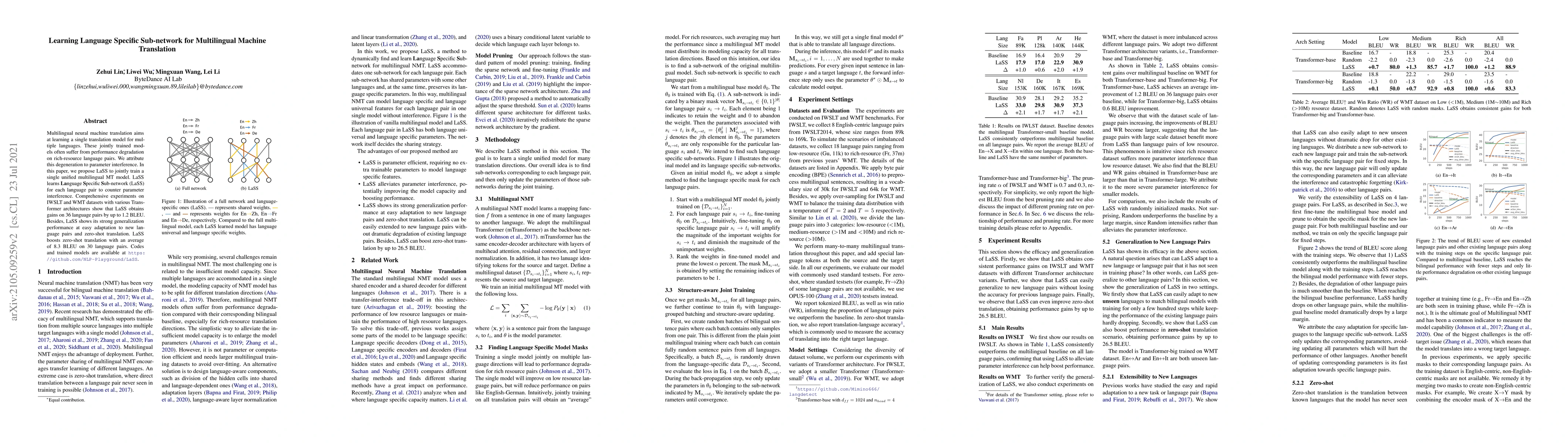 This paper proposes LaSS, a method to mitigate parameter interference in multilingual neural machine translation by learning Language Specific Sub-networks for each language pair, achieving up to 1.2 BLEU score improvements on 36 language pairs and demonstrating strong zero-shot translation performance.