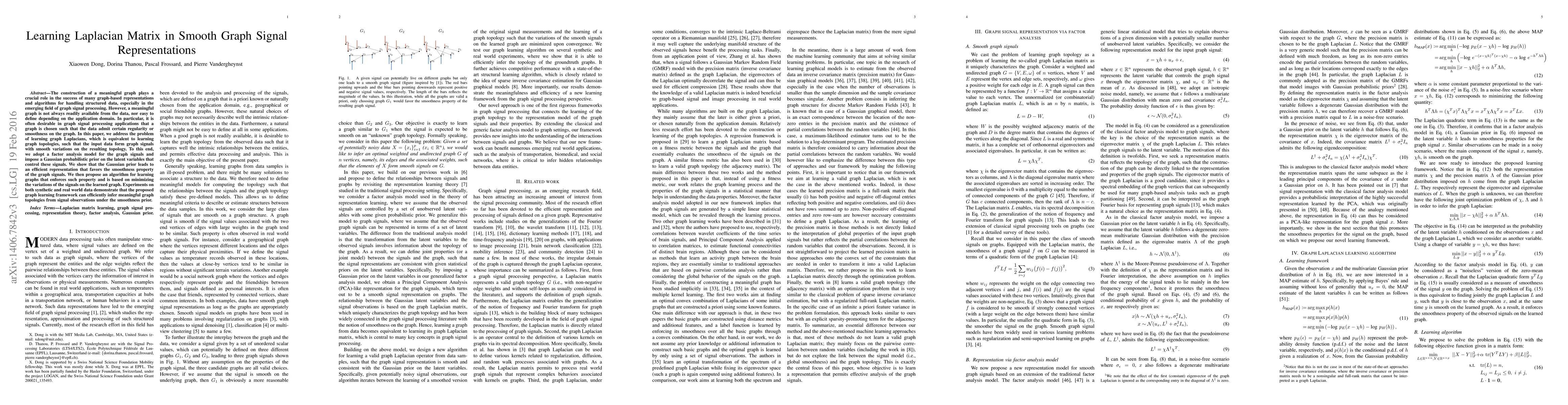 The construction of a meaningful graph plays a crucial role in the success of many graph-based representations and algorithms for handling structured data, especially in the emerging field of graph signal processing. However, a meaningful graph is not always readily available from the data, nor easy to define depending on the application domain. In particular, it is often desirable in graph signal processing applications that a graph is chosen such that the data admit certain regularity or smoothness on the graph. In this paper, we address the problem of learning graph Laplacians, which is equivalent to learning graph topologies, such that the input data form graph signals with smooth variations on the resulting topology. To this end, we adopt a factor analysis model for the graph signals and impose a Gaussian probabilistic prior on the latent variables that control these signals. We show that the Gaussian prior leads to an efficient representation that favors the smoothness property of the graph signals. We then propose an algorithm for learning graphs that enforces such property and is based on minimizing the variations of the signals on the learned graph. Experiments on both synthetic and real world data demonstrate that the proposed graph learning framework can efficiently infer meaningful graph topologies from signal observations under the smoothness prior.