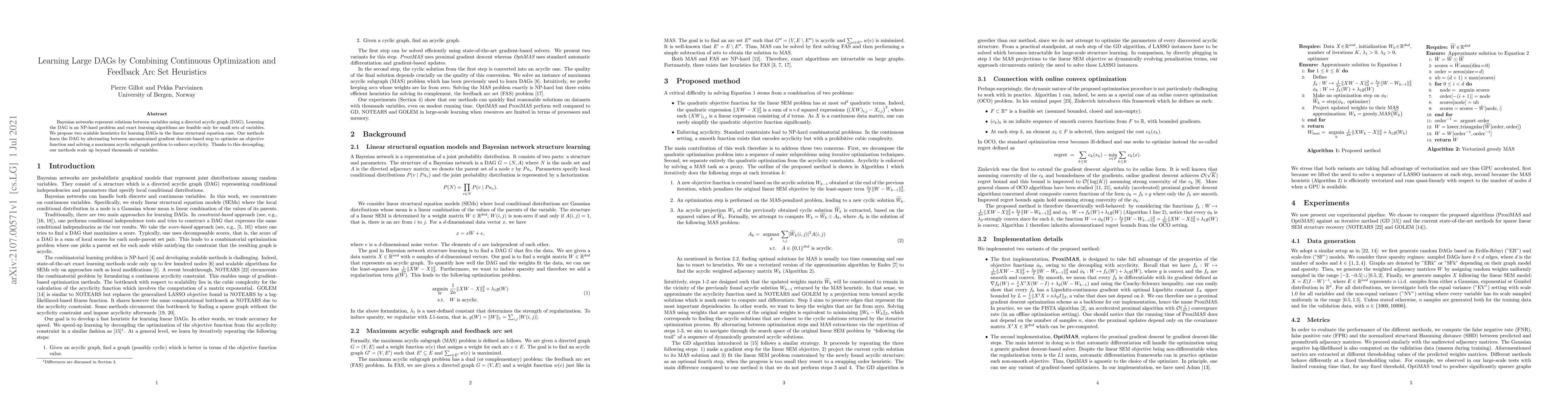 Bayesian networks represent relations between variables using a directed acyclic graph (DAG). Learning the DAG is an NP-hard problem and exact learning algorithms are feasible only for small sets of variables. We propose two scalable heuristics for learning DAGs in the linear structural equation case. Our methods learn the DAG by alternating between unconstrained gradient descent-based step to optimize an objective function and solving a maximum acyclic subgraph problem to enforce acyclicity. Thanks to this decoupling, our methods scale up beyond thousands of variables.