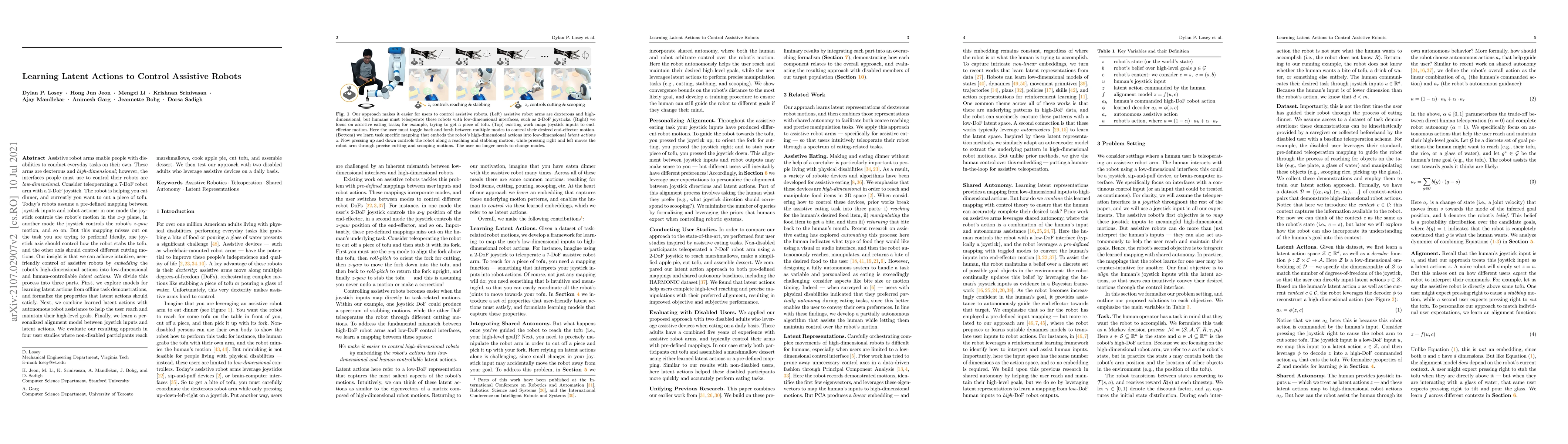 This research proposes a method to control assistive robots through latent actions, enabling intuitive operation by mapping high-dimensional robot actions to low-dimensional joystick inputs. The study evaluates the approach through user studies involving both non-disabled participants and disabled adults performing various tasks.