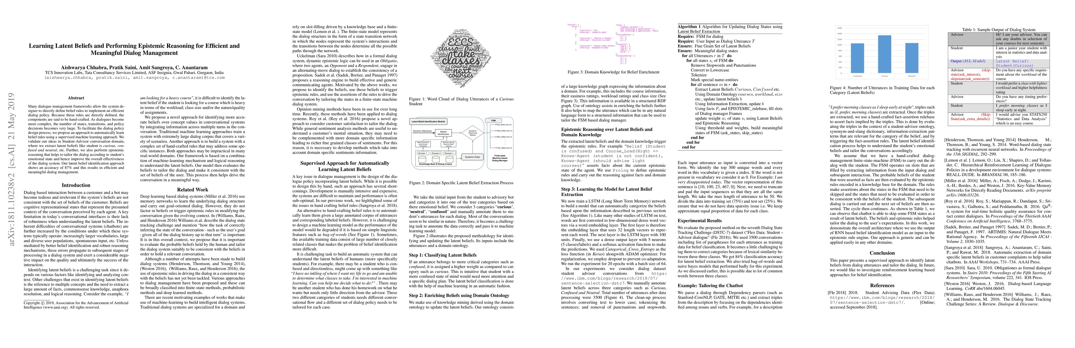 Many dialogue management frameworks allow the system designer to directly define belief rules to implement an efficient dialog policy. Because these rules are directly defined, the components are said to be hand-crafted. As dialogues become more complex, the number of states, transitions, and policy decisions becomes very large. To facilitate the dialog policy design process, we propose an approach to automatically learn belief rules using a supervised machine learning approach. We validate our ideas in Student-Advisor conversation domain, where we extract latent beliefs like student is curious, confused and neutral, etc. Further, we also perform epistemic reasoning that helps to tailor the dialog according to student's emotional state and hence improve the overall effectiveness of the dialog system. Our latent belief identification approach shows an accuracy of 87% and this results in efficient and meaningful dialog management.