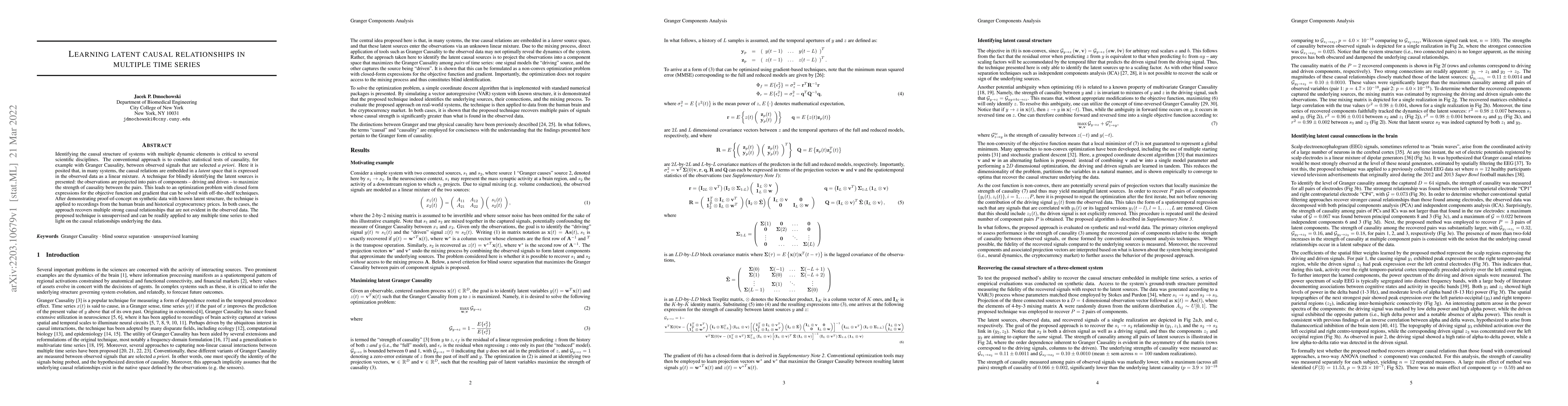 This paper introduces a novel technique for identifying latent causal relationships in multiple time series data by projecting observations into driving and driven components. The method recovers hidden causal relationships in synthetic data, human brain recordings, and cryptocurrency price histories, demonstrating its applicability across diverse datasets.