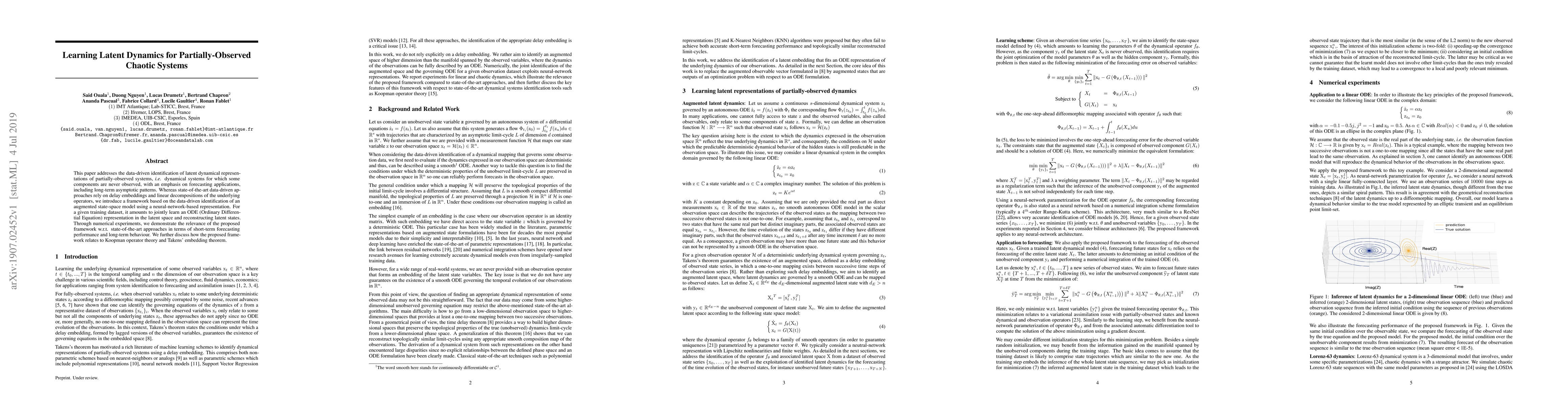 This paper addresses the data-driven identification of latent dynamical representations of partially-observed systems, i.e., dynamical systems for which some components are never observed, with an emphasis on forecasting applications, including long-term asymptotic patterns. Whereas state-of-the-art data-driven approaches rely on delay embeddings and linear decompositions of the underlying operators, we introduce a framework based on the data-driven identification of an augmented state-space model using a neural-network-based representation. For a given training dataset, it amounts to jointly learn an ODE (Ordinary Differential Equation) representation in the latent space and reconstructing latent states. Through numerical experiments, we demonstrate the relevance of the proposed framework w.r.t. state-of-the-art approaches in terms of short-term forecasting performance and long-term behaviour. We further discuss how the proposed framework relates to Koopman operator theory and Takens' embedding theorem.