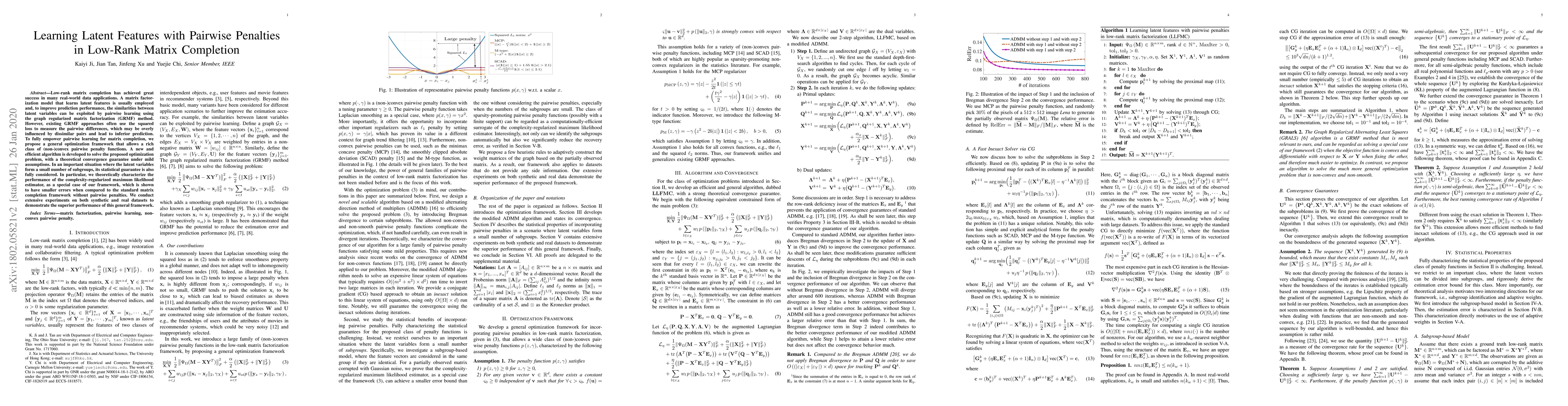 This paper proposes a novel optimization framework for low-rank matrix completion using a variety of (non-)convex pairwise penalty functions to improve latent feature learning. An efficient algorithm with theoretical convergence guarantees is developed, and experiments show superior performance compared to standard matrix completion methods.