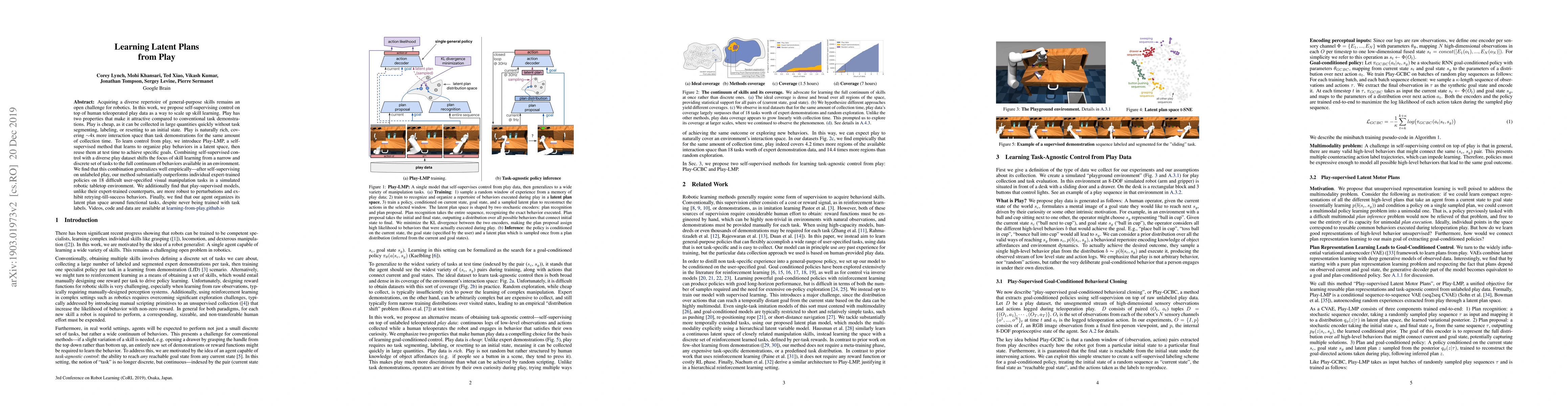 Acquiring a diverse repertoire of general-purpose skills remains an open challenge for robotics. In this work, we propose self-supervising control on top of human teleoperated play data as a way to scale up skill learning. Play has two properties that make it attractive compared to conventional task demonstrations. Play is cheap, as it can be collected in large quantities quickly without task segmenting, labeling, or resetting to an initial state. Play is naturally rich, covering ~4x more interaction space than task demonstrations for the same amount of collection time. To learn control from play, we introduce Play-LMP, a self-supervised method that learns to organize play behaviors in a latent space, then reuse them at test time to achieve specific goals. Combining self-supervised control with a diverse play dataset shifts the focus of skill learning from a narrow and discrete set of tasks to the full continuum of behaviors available in an environment. We find that this combination generalizes well empirically---after self-supervising on unlabeled play, our method substantially outperforms individual expert-trained policies on 18 difficult user-specified visual manipulation tasks in a simulated robotic tabletop environment. We additionally find that play-supervised models, unlike their expert-trained counterparts, are more robust to perturbations and exhibit retrying-till-success behaviors. Finally, we find that our agent organizes its latent plan space around functional tasks, despite never being trained with task labels. Videos, code and data are available at learning-from-play.github.io