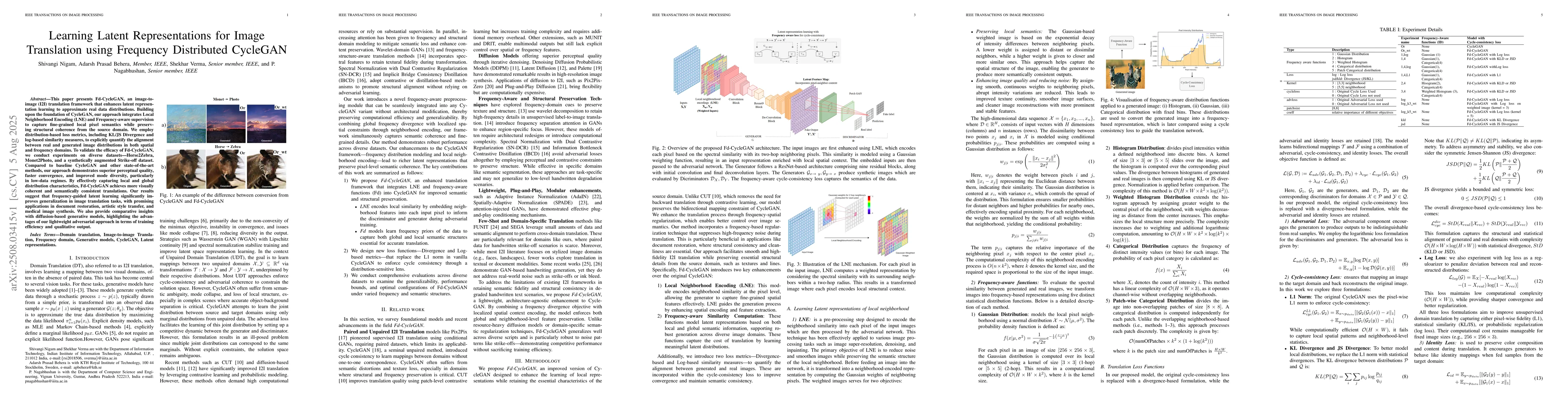 This paper presents Fd-CycleGAN, an image-to-image (I2I) translation framework that enhances latent representation learning to approximate real data distributions. Building upon the foundation of CycleGAN, our approach integrates Local Neighborhood Encoding (LNE) and frequency-aware supervision to capture fine-grained local pixel semantics while preserving structural coherence from the source domain. We employ distribution-based loss metrics, including KL/JS divergence and log-based similarity measures, to explicitly quantify the alignment between real and generated image distributions in both spatial and frequency domains. To validate the efficacy of Fd-CycleGAN, we conduct experiments on diverse datasets -- Horse2Zebra, Monet2Photo, and a synthetically augmented Strike-off dataset. Compared to baseline CycleGAN and other state-of-the-art methods, our approach demonstrates superior perceptual quality, faster convergence, and improved mode diversity, particularly in low-data regimes. By effectively capturing local and global distribution characteristics, Fd-CycleGAN achieves more visually coherent and semantically consistent translations. Our results suggest that frequency-guided latent learning significantly improves generalization in image translation tasks, with promising applications in document restoration, artistic style transfer, and medical image synthesis. We also provide comparative insights with diffusion-based generative models, highlighting the advantages of our lightweight adversarial approach in terms of training efficiency and qualitative output.
