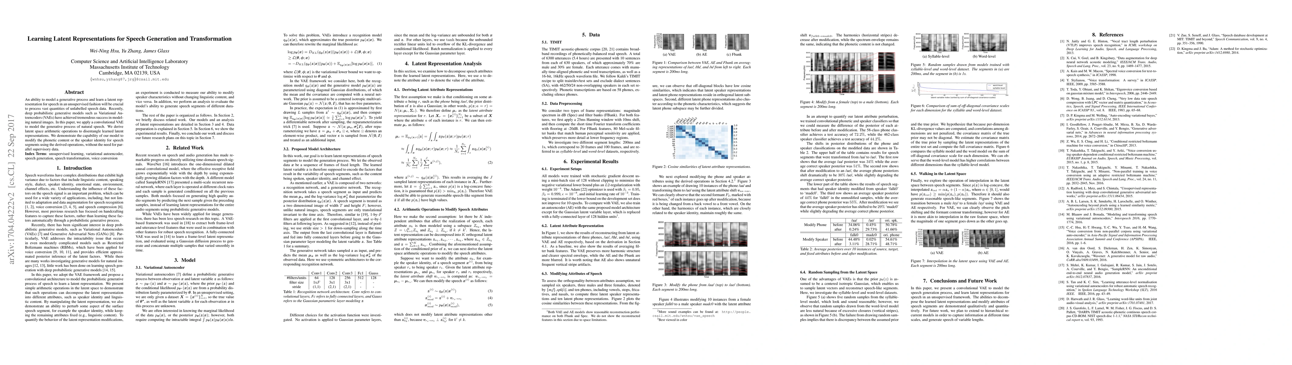 This paper proposes a convolutional Variational Autoencoder (VAE) to model the generative process of natural speech in an unsupervised manner, and introduces latent space arithmetic operations to disentangle and manipulate learned representations, enabling modification of phonetic content or speaker identity without parallel data.