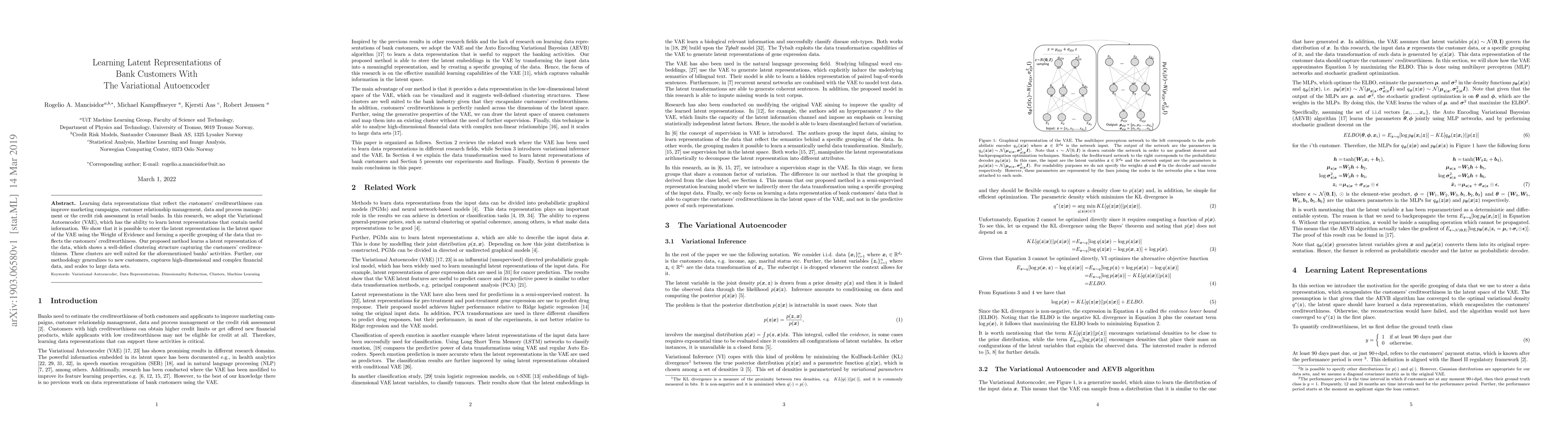 This research employs a Variational Autoencoder (VAE) to learn latent representations of bank customers that reflect their creditworthiness, enhancing marketing and risk assessment. The method successfully clusters customers based on creditworthiness and generalizes to new data, scaling effectively for large datasets.