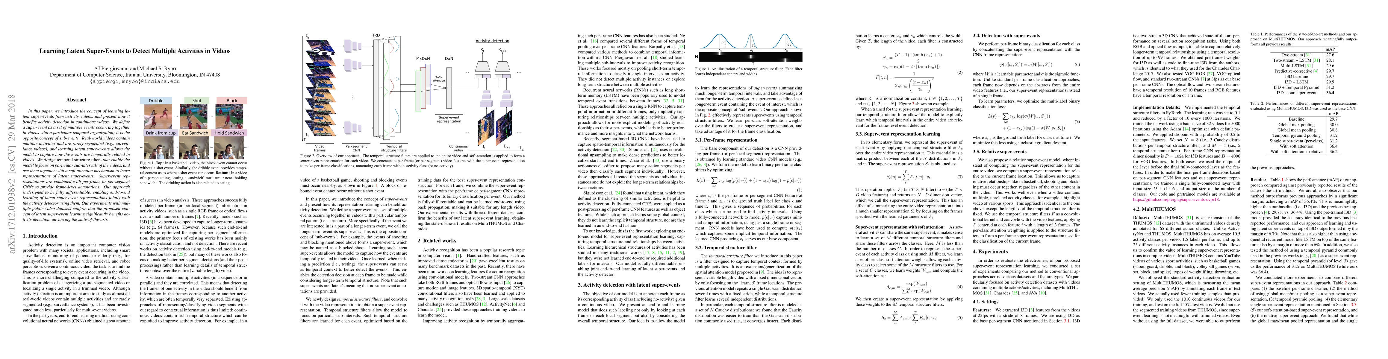 This paper proposes learning latent super-events from continuous activity videos to improve detection of multiple activities. It introduces temporal structure filters and a soft attention mechanism to capture temporal relationships, achieving better state-of-the-art results on public datasets.