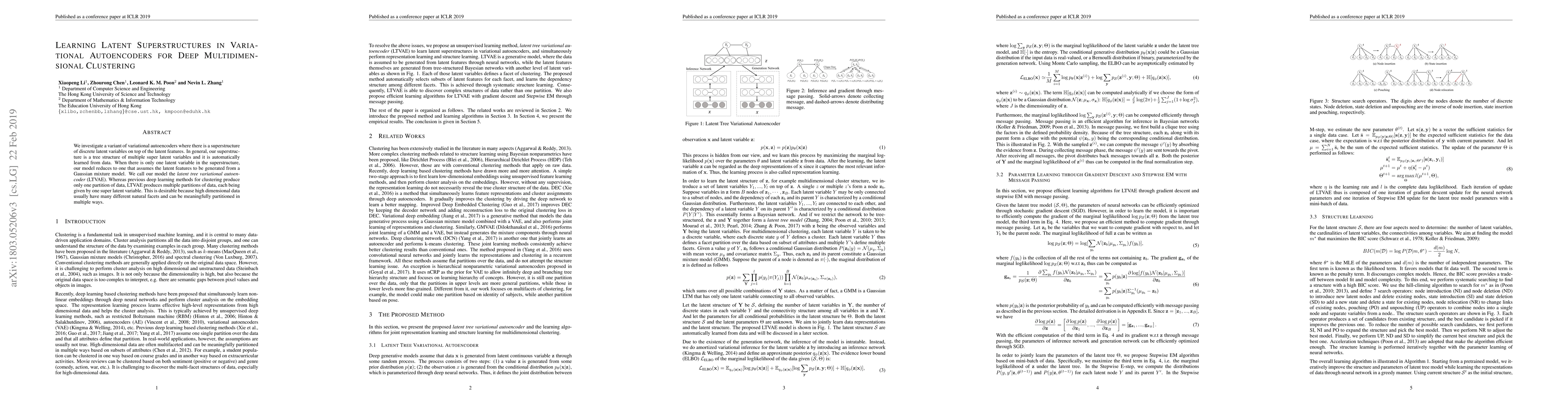 We investigate a variant of variational autoencoders where there is a superstructure of discrete latent variables on top of the latent features. In general, our superstructure is a tree structure of multiple super latent variables and it is automatically learned from data. When there is only one latent variable in the superstructure, our model reduces to one that assumes the latent features to be generated from a Gaussian mixture model. We call our model the latent tree variational autoencoder (LTVAE). Whereas previous deep learning methods for clustering produce only one partition of data, LTVAE produces multiple partitions of data, each being given by one super latent variable. This is desirable because high dimensional data usually have many different natural facets and can be meaningfully partitioned in multiple ways.