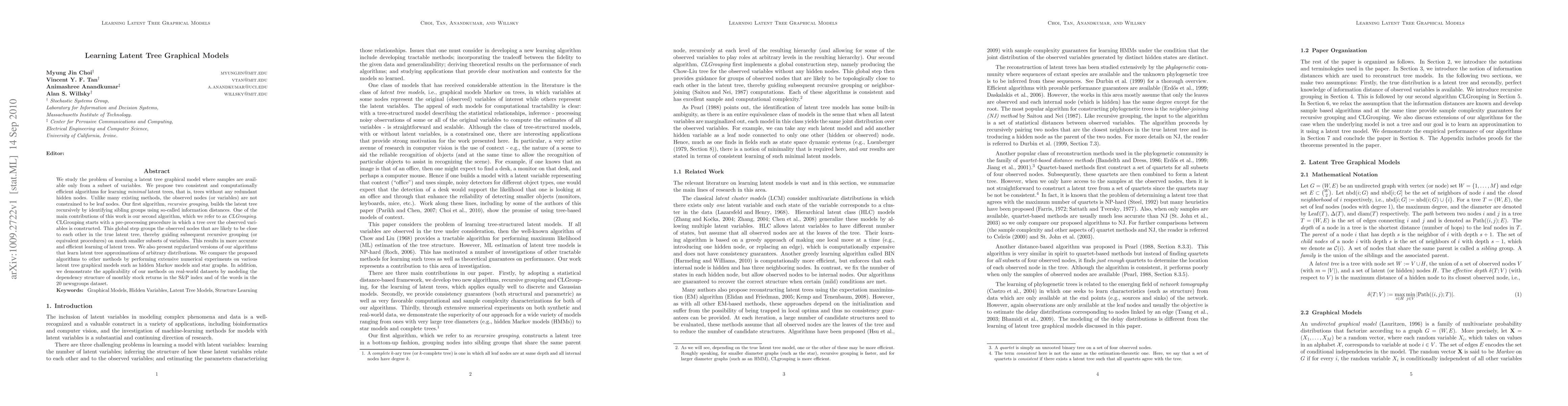 This paper proposes two efficient algorithms for learning minimal latent tree graphical models from incomplete data. The recursive grouping and CLGrouping algorithms, especially the latter, improve accuracy and efficiency by leveraging information distances and pre-processing steps. The methods are validated through experiments on various models and real-world datasets.