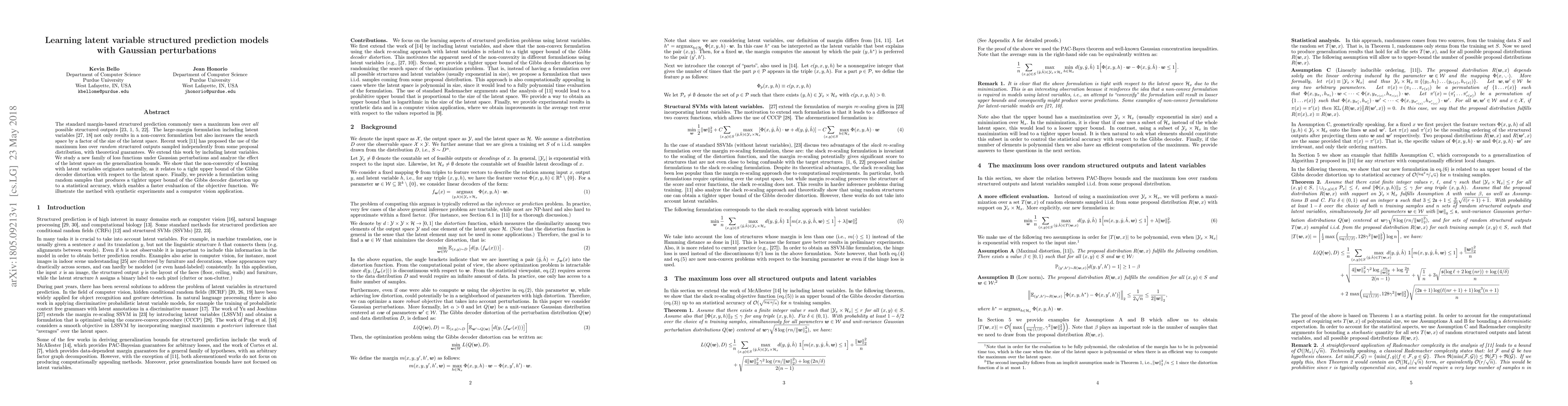 This paper proposes a new family of loss functions for learning latent variable structured prediction models under Gaussian perturbations, analyzing the impact of latent variables on generalization bounds. The method introduces a tighter upper bound of the Gibbs decoder distortion and provides a faster evaluation technique, demonstrated through synthetic and computer vision experiments.