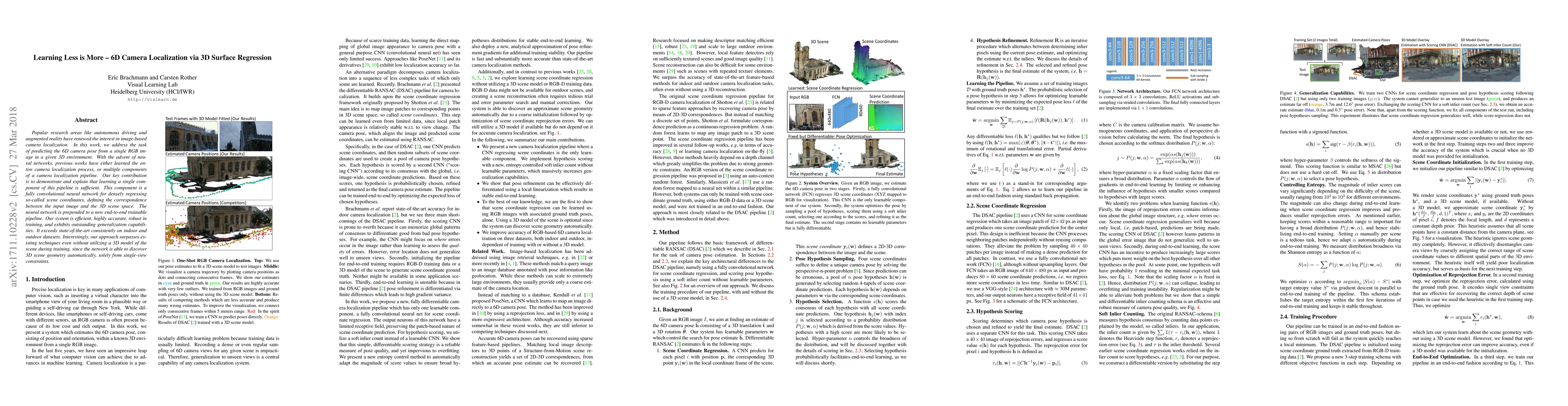 This paper proposes an efficient and accurate method for 6D camera localization using a fully convolutional neural network that regresses scene coordinates from a single RGB image, demonstrating that learning only this component is sufficient. The approach outperforms state-of-the-art methods on various datasets without requiring a 3D model during training.