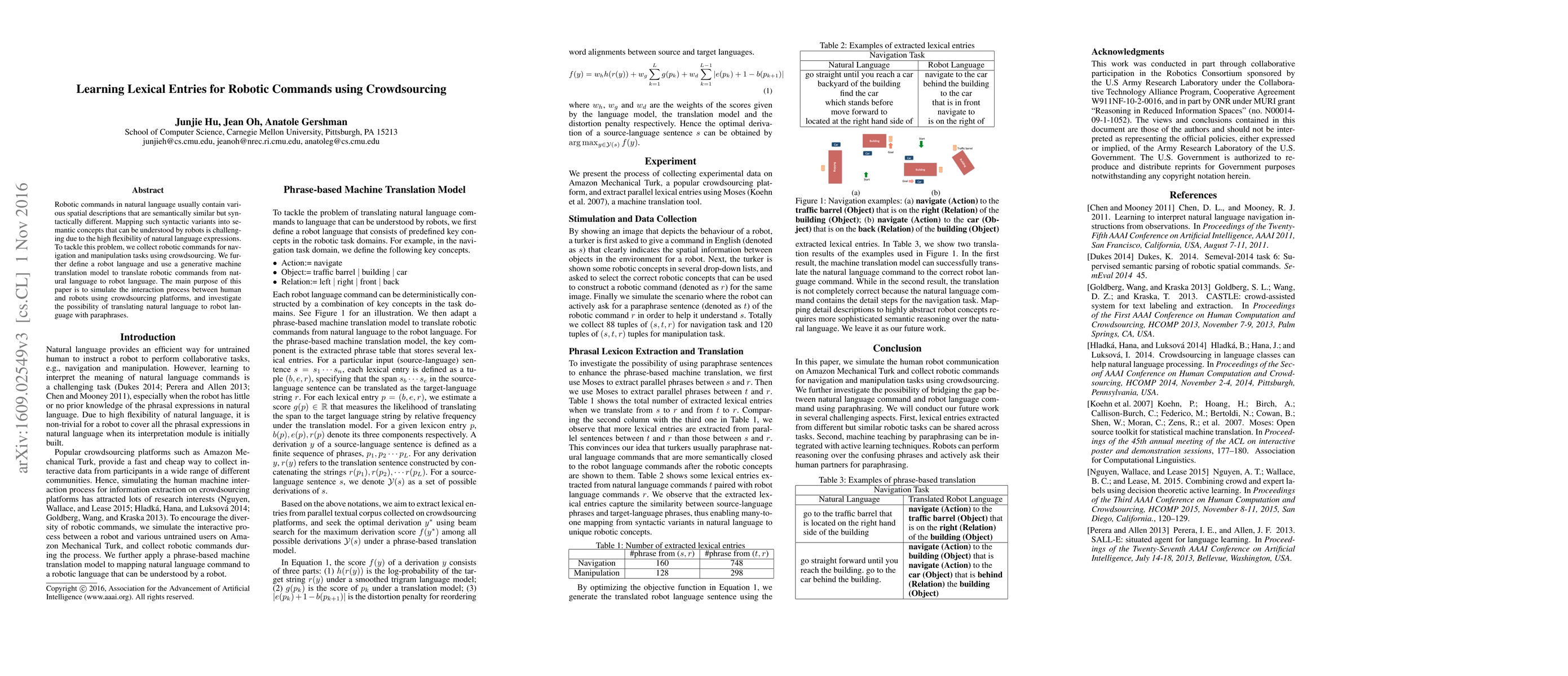 This paper explores using crowdsourcing to gather diverse robotic commands for navigation and manipulation, aiming to map their syntactic variants into a robot language. It employs a generative machine translation model to translate these commands, investigating the feasibility of converting natural language into robot language through paraphrases.