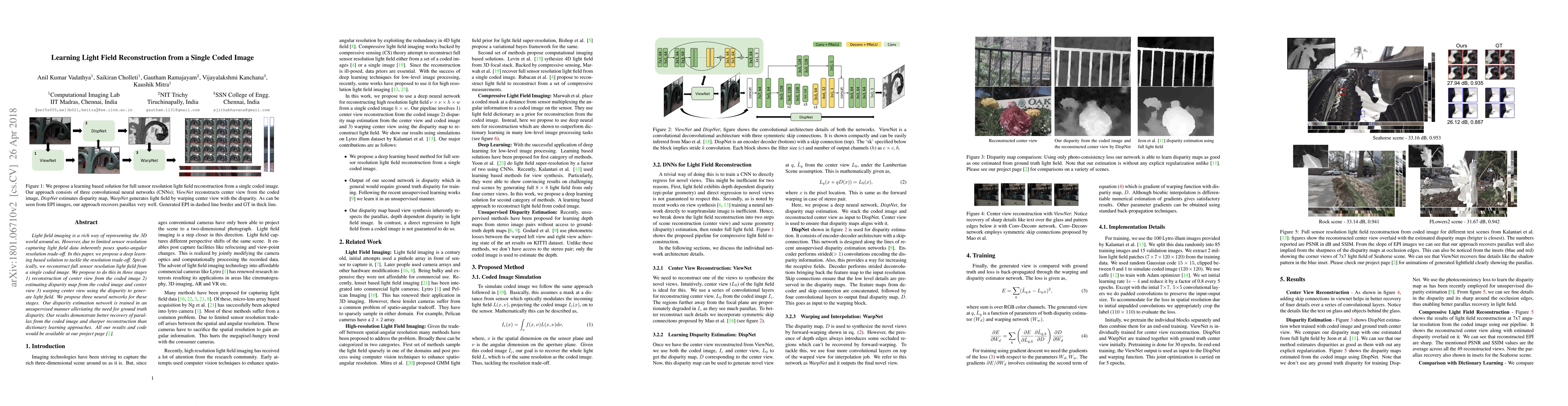 Light field imaging is a rich way of representing the 3D world around us. However, due to limited sensor resolution capturing light field data inherently poses spatio-angular resolution trade-off. In this paper, we propose a deep learning based solution to tackle the resolution trade-off. Specifically, we reconstruct full sensor resolution light field from a single coded image. We propose to do this in three stages 1) reconstruction of center view from the coded image 2) estimating disparity map from the coded image and center view 3) warping center view using the disparity to generate light field. We propose three neural networks for these stages. Our disparity estimation network is trained in an unsupervised manner alleviating the need for ground truth disparity. Our results demonstrate better recovery of parallax from the coded image. Also, we get better results than dictionary learning based approaches both qualitatively and quatitatively.