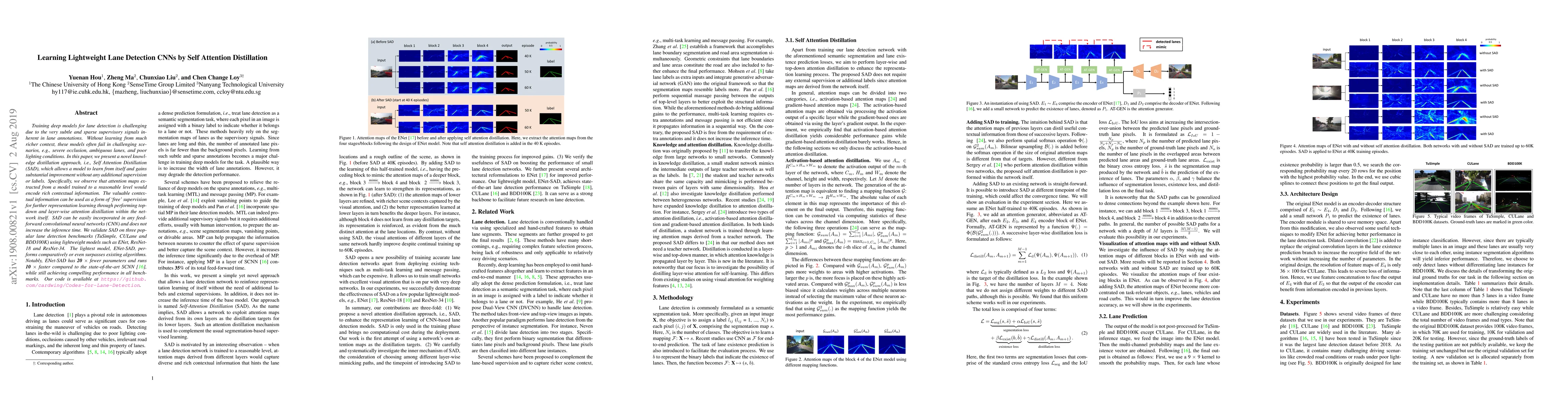 This paper introduces Self Attention Distillation (SAD), a knowledge distillation method that leverages attention maps from a pre-trained model to provide 'free' supervision for lightweight CNNs, improving lane detection performance without additional labels. SAD is shown to enhance models like ENet, achieving comparable or superior results to state-of-the-art methods with significantly fewer parameters and faster inference speeds.