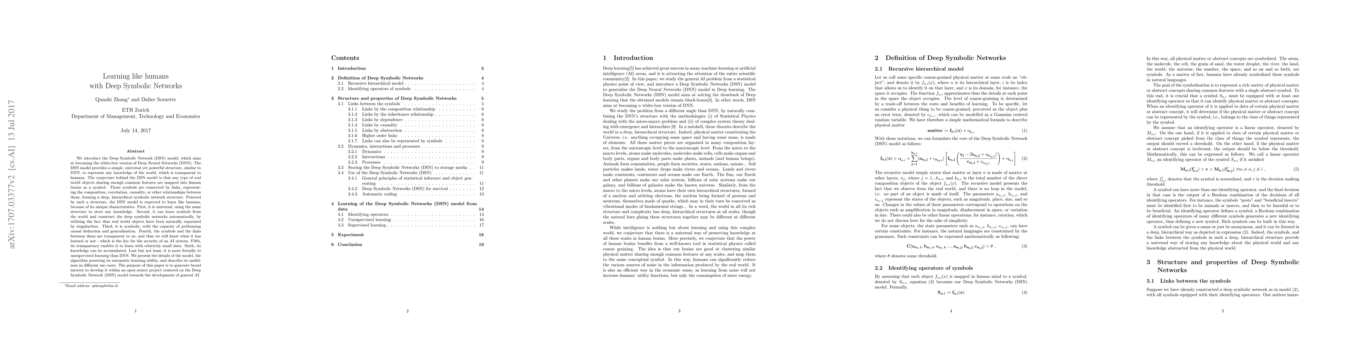 We introduce the Deep Symbolic Network (DSN) model, which aims at becoming the white-box version of Deep Neural Networks (DNN). The DSN model provides a simple, universal yet powerful structure, similar to DNN, to represent any knowledge of the world, which is transparent to humans. The conjecture behind the DSN model is that any type of real world objects sharing enough common features are mapped into human brains as a symbol. Those symbols are connected by links, representing the composition, correlation, causality, or other relationships between them, forming a deep, hierarchical symbolic network structure. Powered by such a structure, the DSN model is expected to learn like humans, because of its unique characteristics. First, it is universal, using the same structure to store any knowledge. Second, it can learn symbols from the world and construct the deep symbolic networks automatically, by utilizing the fact that real world objects have been naturally separated by singularities. Third, it is symbolic, with the capacity of performing causal deduction and generalization. Fourth, the symbols and the links between them are transparent to us, and thus we will know what it has learned or not - which is the key for the security of an AI system. Fifth, its transparency enables it to learn with relatively small data. Sixth, its knowledge can be accumulated. Last but not least, it is more friendly to unsupervised learning than DNN. We present the details of the model, the algorithm powering its automatic learning ability, and describe its usefulness in different use cases. The purpose of this paper is to generate broad interest to develop it within an open source project centered on the Deep Symbolic Network (DSN) model towards the development of general AI.