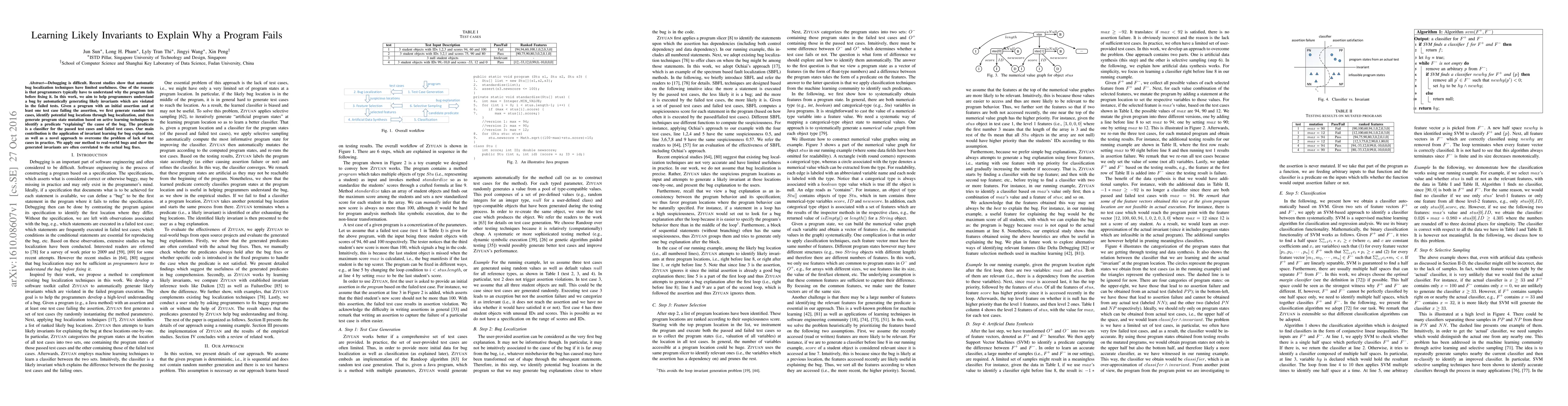 This paper proposes a method to automatically generate likely invariants that explain why a program fails by identifying violated predicates. It uses random test cases, active learning, and bug localization to create a classifier that differentiates between passed and failed test cases, aiming to assist programmers in understanding and fixing bugs.