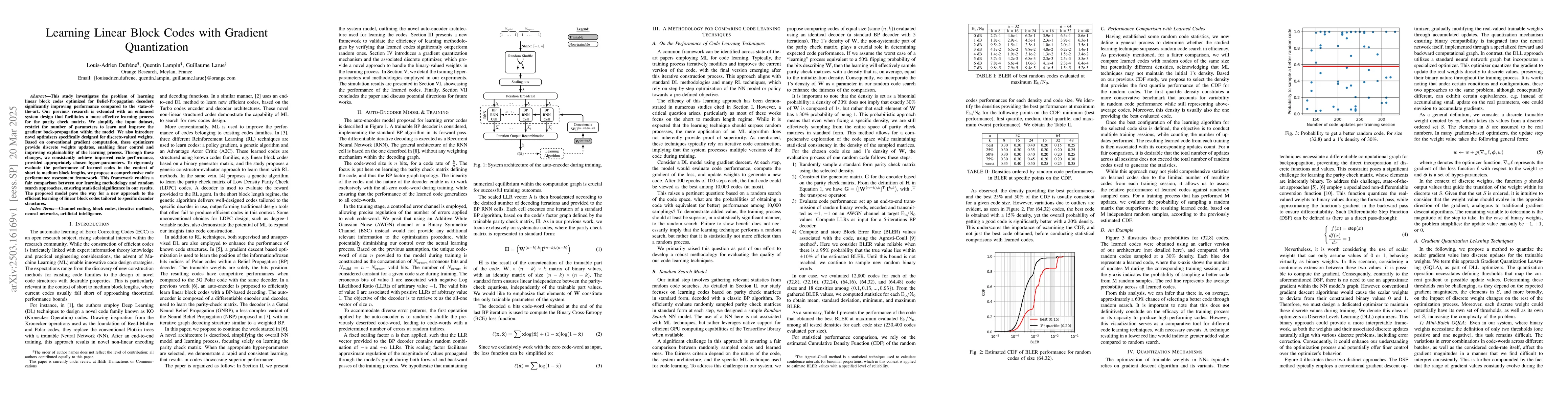 Novel Discrete Levels Learning (DLL) optimizers for discrete-valued weights, a comprehensive code performance assessment framework, and a streamlined system design for learning linear block codes.