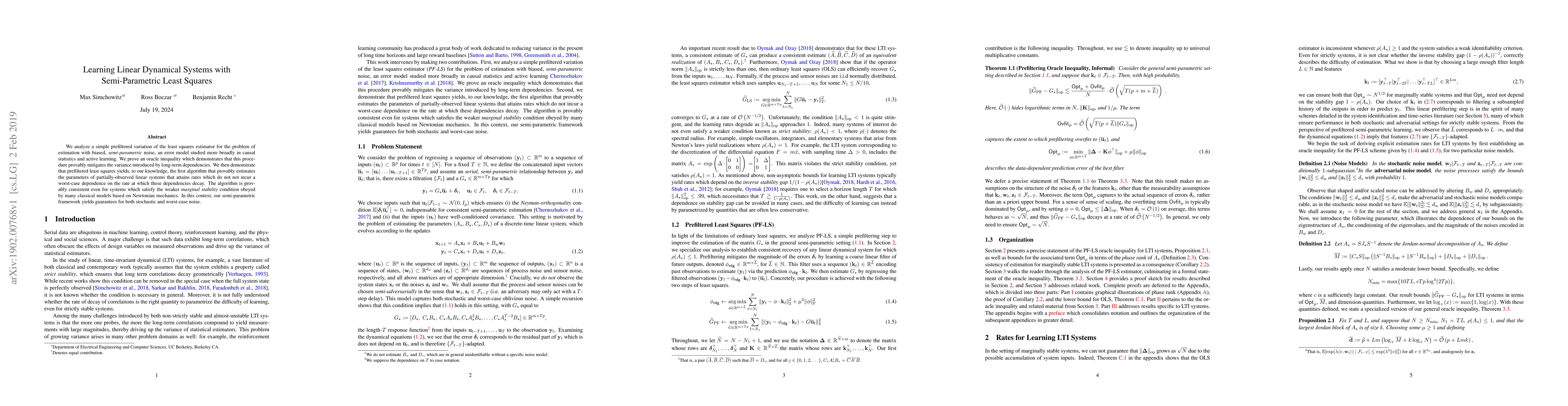 This paper proposes a prefiltered least squares estimator for learning linear dynamical systems with semi-parametric noise, proving an oracle inequality that mitigates variance from long-term dependencies. The algorithm is the first to consistently estimate parameters without worst-case dependence on decay rates, even under marginal stability conditions.