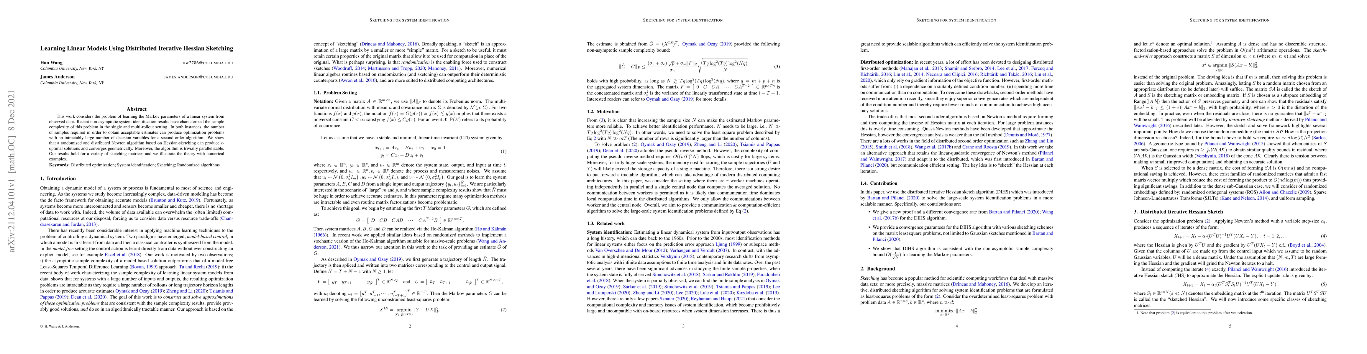 This work considers the problem of learning the Markov parameters of a linear system from observed data. Recent non-asymptotic system identification results have characterized the sample complexity of this problem in the single and multi-rollout setting. In both instances, the number of samples required in order to obtain acceptable estimates can produce optimization problems with an intractably large number of decision variables for a second-order algorithm. We show that a randomized and distributed Newton algorithm based on Hessian-sketching can produce $\epsilon$-optimal solutions and converges geometrically. Moreover, the algorithm is trivially parallelizable. Our results hold for a variety of sketching matrices and we illustrate the theory with numerical examples.