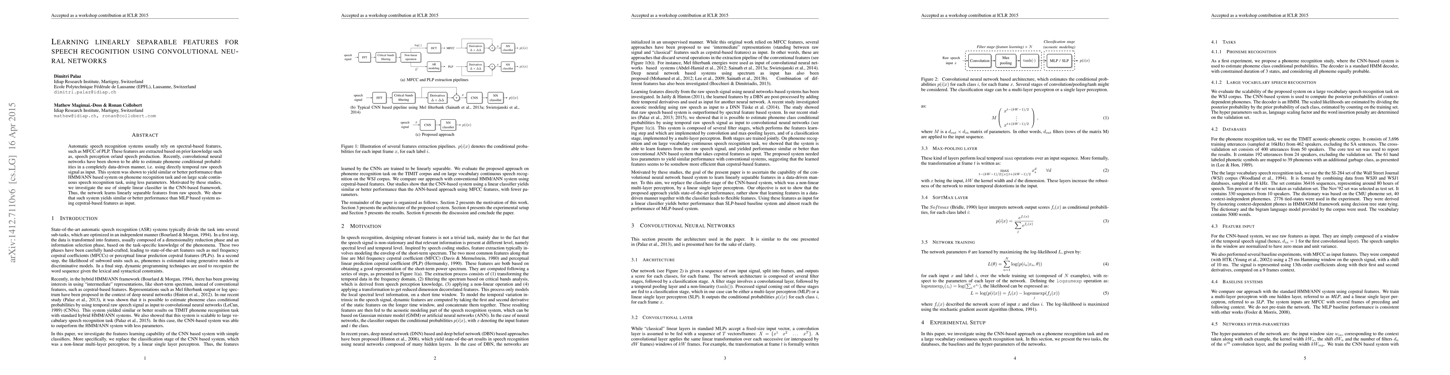 This paper explores using convolutional neural networks (CNNs) to learn linearly separable features directly from raw speech signals for speech recognition, achieving comparable or superior performance to traditional methods using cepstral-based features. The study demonstrates that a simple linear classifier within the CNN framework can outperform MLP systems reliant on MFCC or PLP features.