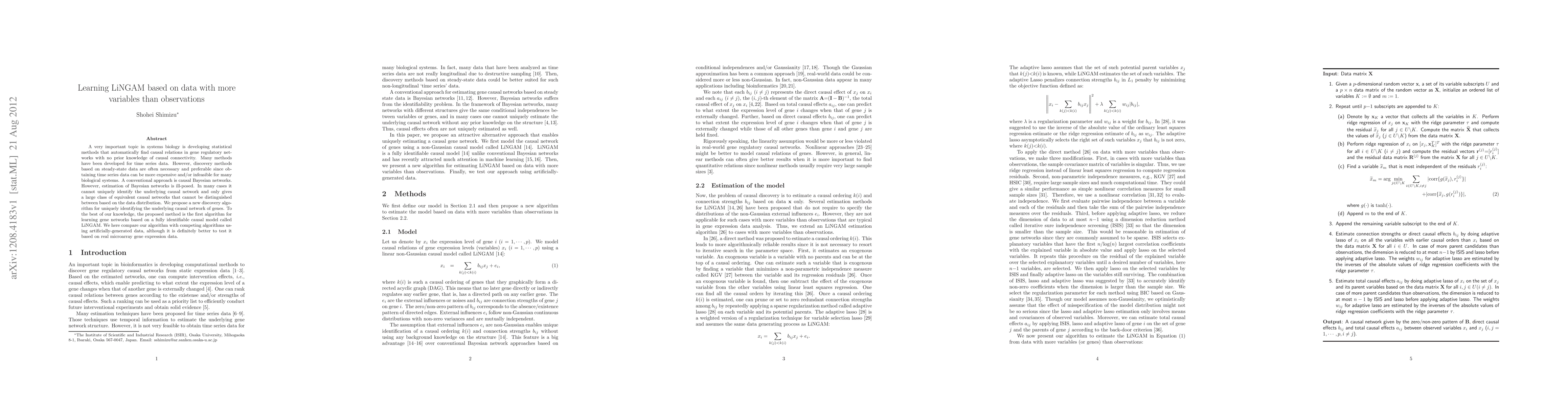 A very important topic in systems biology is developing statistical methods that automatically find causal relations in gene regulatory networks with no prior knowledge of causal connectivity. Many methods have been developed for time series data. However, discovery methods based on steady-state data are often necessary and preferable since obtaining time series data can be more expensive and/or infeasible for many biological systems. A conventional approach is causal Bayesian networks. However, estimation of Bayesian networks is ill-posed. In many cases it cannot uniquely identify the underlying causal network and only gives a large class of equivalent causal networks that cannot be distinguished between based on the data distribution. We propose a new discovery algorithm for uniquely identifying the underlying causal network of genes. To the best of our knowledge, the proposed method is the first algorithm for learning gene networks based on a fully identifiable causal model called LiNGAM. We here compare our algorithm with competing algorithms using artificially-generated data, although it is definitely better to test it based on real microarray gene expression data.