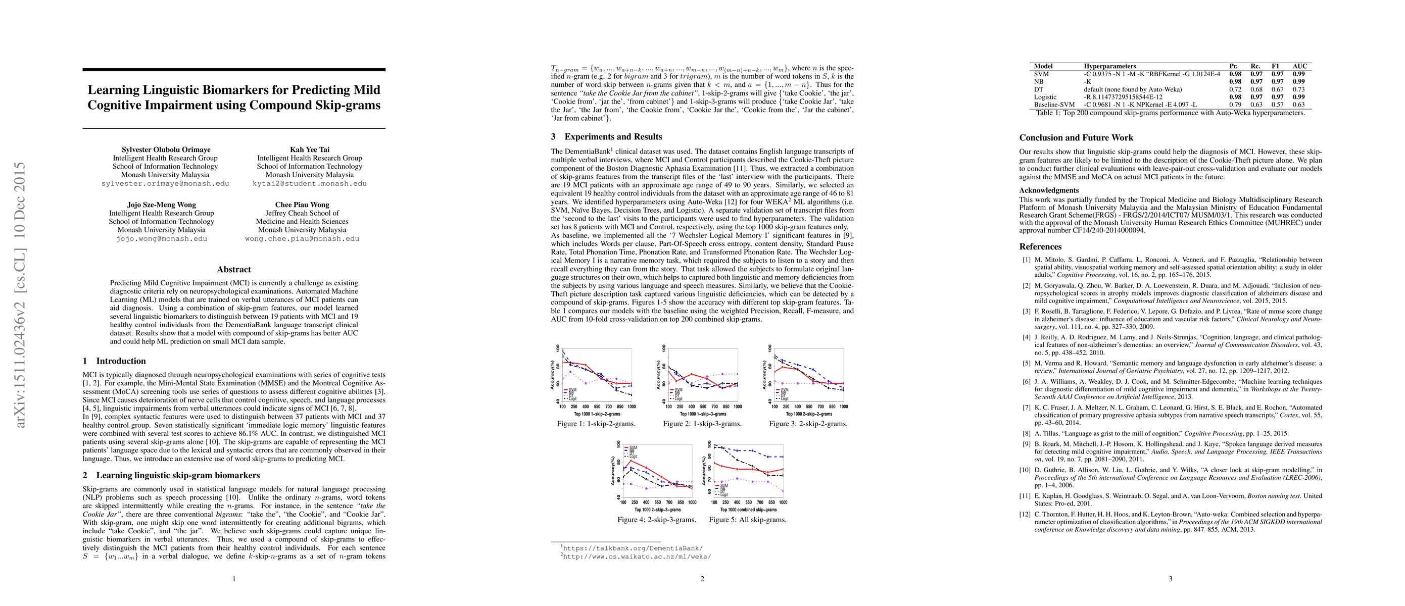 Predicting Mild Cognitive Impairment (MCI) is currently a challenge as existing diagnostic criteria rely on neuropsychological examinations. Automated Machine Learning (ML) models that are trained on verbal utterances of MCI patients can aid diagnosis. Using a combination of skip-gram features, our model learned several linguistic biomarkers to distinguish between 19 patients with MCI and 19 healthy control individuals from the DementiaBank language transcript clinical dataset. Results show that a model with compound of skip-grams has better AUC and could help ML prediction on small MCI data sample.
