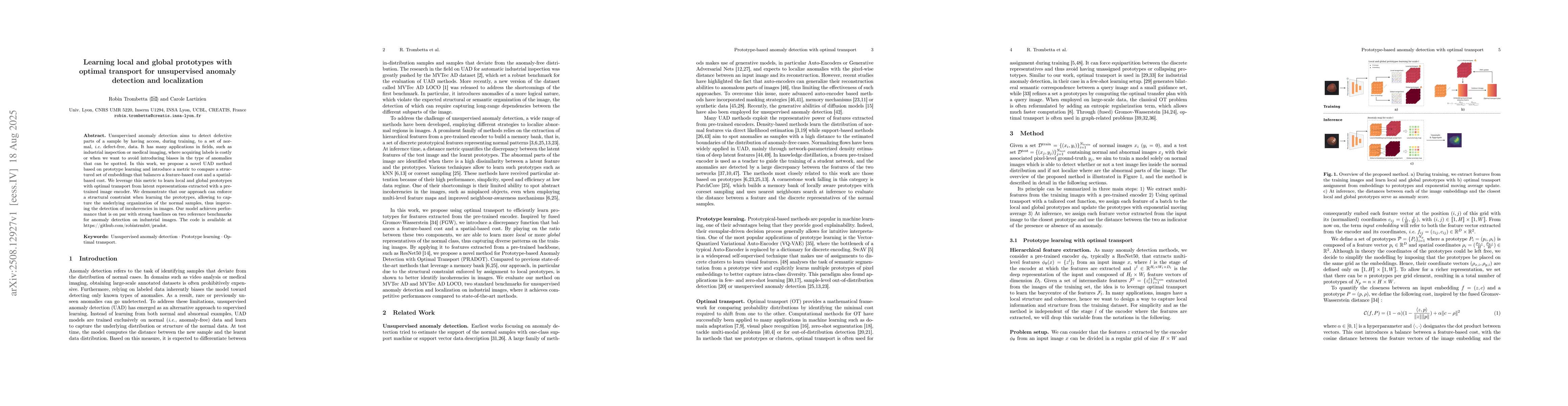 Unsupervised anomaly detection aims to detect defective parts of a sample by having access, during training, to a set of normal, i.e. defect-free, data. It has many applications in fields, such as industrial inspection or medical imaging, where acquiring labels is costly or when we want to avoid introducing biases in the type of anomalies that can be spotted. In this work, we propose a novel UAD method based on prototype learning and introduce a metric to compare a structured set of embeddings that balances a feature-based cost and a spatial-based cost. We leverage this metric to learn local and global prototypes with optimal transport from latent representations extracted with a pre-trained image encoder. We demonstrate that our approach can enforce a structural constraint when learning the prototypes, allowing to capture the underlying organization of the normal samples, thus improving the detection of incoherencies in images. Our model achieves performance that is on par with strong baselines on two reference benchmarks for anomaly detection on industrial images. The code is available at https://github.com/robintrmbtt/pradot.