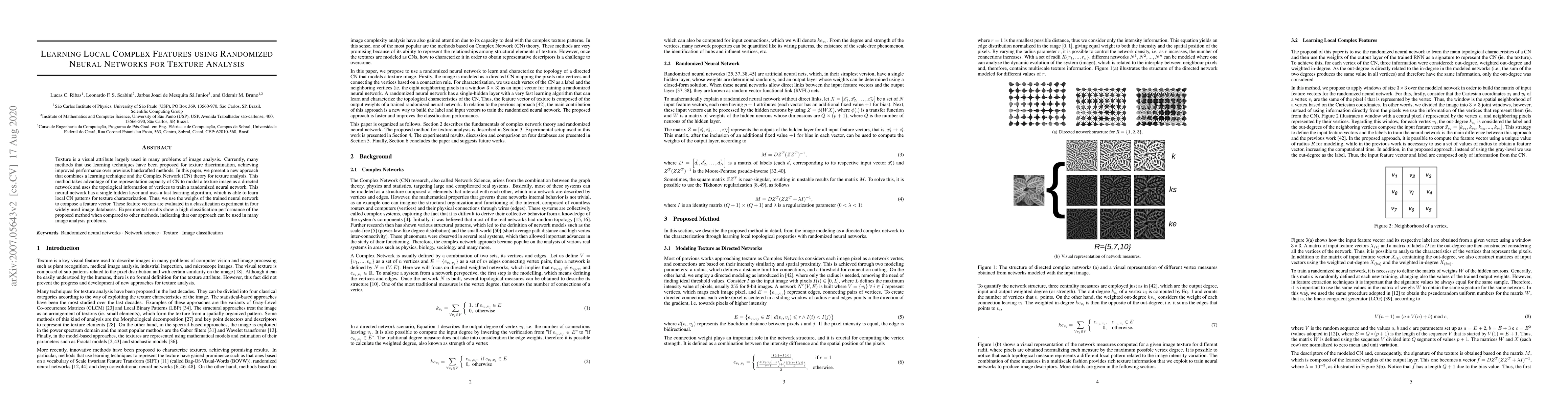 This paper proposes a novel method combining Complex Network theory and randomized neural networks for texture analysis, achieving high classification performance in experiments across four image databases. The method models texture images as directed networks and trains a neural network to learn local patterns, outperforming other methods.