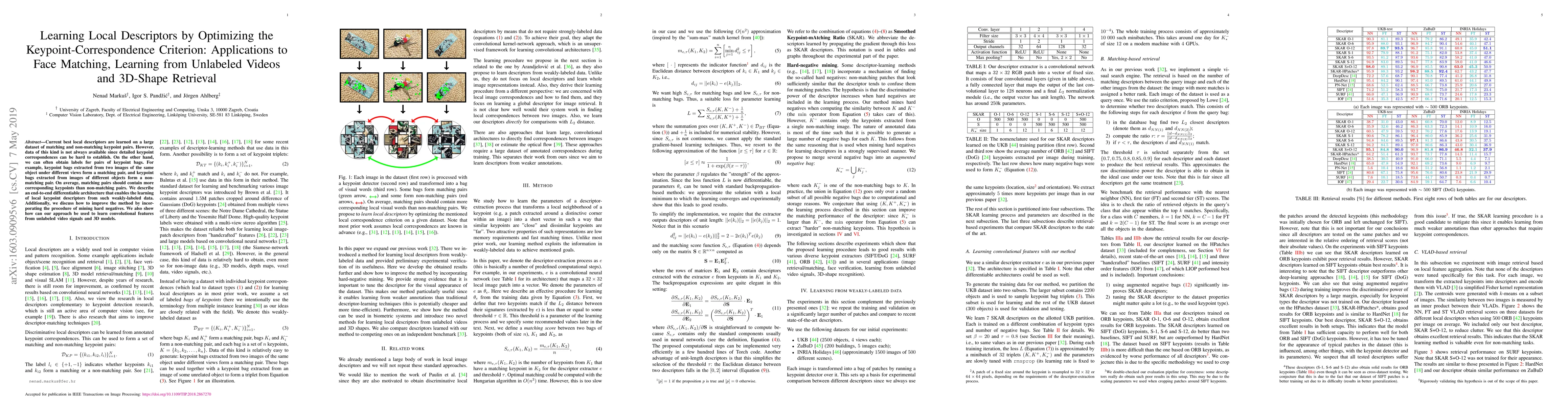 Current best local descriptors are learned on a large dataset of matching and non-matching keypoint pairs. However, data of this kind is not always available since detailed keypoint correspondences can be hard to establish. On the other hand, we can often obtain labels for pairs of keypoint bags. For example, keypoint bags extracted from two images of the same object under different views form a matching pair, and keypoint bags extracted from images of different objects form a non-matching pair. On average, matching pairs should contain more corresponding keypoints than non-matching pairs. We describe an end-to-end differentiable architecture that enables the learning of local keypoint descriptors from such weakly-labeled data. Additionally, we discuss how to improve the method by incorporating the procedure of mining hard negatives. We also show how can our approach be used to learn convolutional features from unlabeled video signals and 3D models. Our implementation is available at https://github.com/nenadmarkus/wlrn
