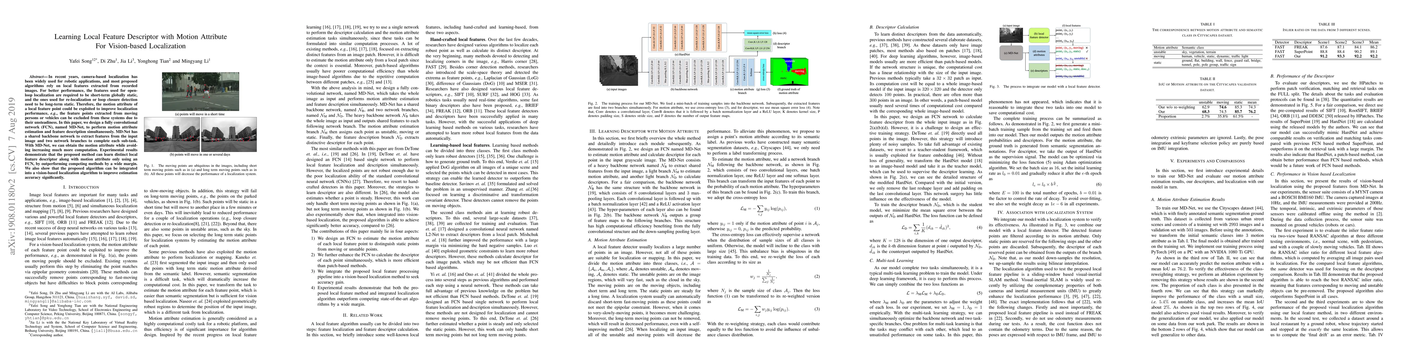 This paper proposes MD-Net, a fully convolutional network that estimates motion attributes and describes local features simultaneously, enhancing vision-based localization by excluding unstable features from moving objects. Experimental results show significant improvements over competing methods.