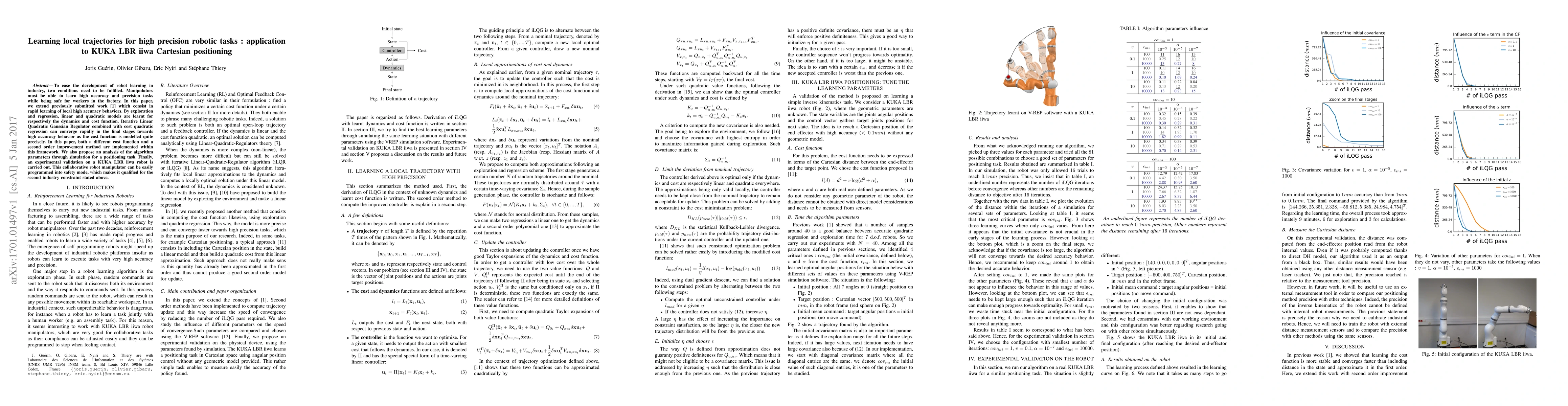 To ease the development of robot learning in industry, two conditions need to be fulfilled. Manipulators must be able to learn high accuracy and precision tasks while being safe for workers in the factory. In this paper, we extend previously submitted work which consists in rapid learning of local high accuracy behaviors. By exploration and regression, linear and quadratic models are learnt for respectively the dynamics and cost function. Iterative Linear Quadratic Gaussian Regulator combined with cost quadratic regression can converge rapidly in the final stages towards high accuracy behavior as the cost function is modelled quite precisely. In this paper, both a different cost function and a second order improvement method are implemented within this framework. We also propose an analysis of the algorithm parameters through simulation for a positioning task. Finally, an experimental validation on a KUKA LBR iiwa robot is carried out. This collaborative robot manipulator can be easily programmed into safety mode, which makes it qualified for the second industry constraint stated above.