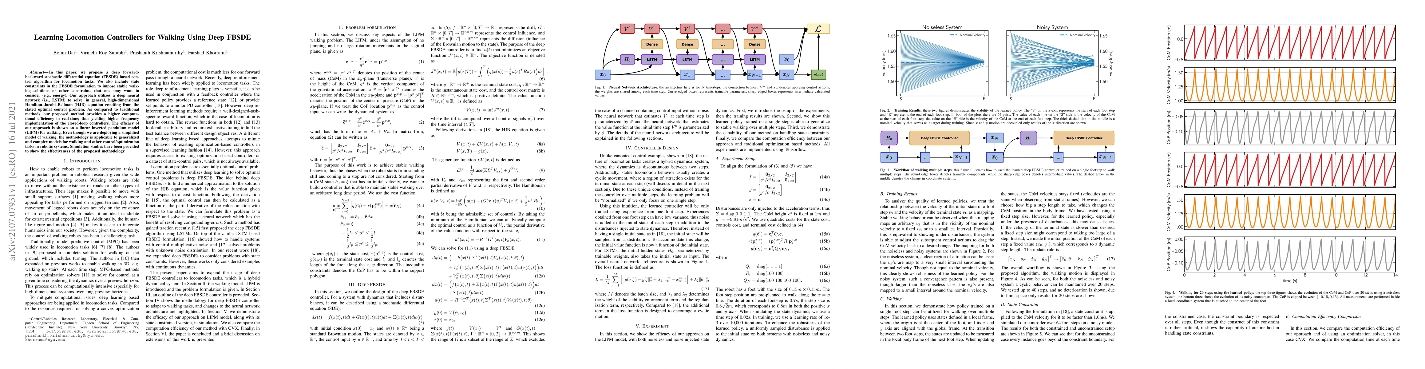 In this paper, we propose a deep forward-backward stochastic differential equation (FBSDE) based control algorithm for locomotion tasks. We also include state constraints in the FBSDE formulation to impose stable walking solutions or other constraints that one may want to consider (e.g., energy). Our approach utilizes a deep neural network (i.e., LSTM) to solve, in general, high-dimensional Hamilton-Jacobi-Bellman (HJB) equation resulting from the stated optimal control problem. As compared to traditional methods, our proposed method provides a higher computational efficiency in real-time; thus yielding higher frequency implementation of the closed-loop controllers. The efficacy of our approach is shown on a linear inverted pendulum model (LIPM) for walking. Even though we are deploying a simplified model of walking, the methodology is applicable to generalized and complex models for walking and other control/optimization tasks in robotic systems. Simulation studies have been provided to show the effectiveness of the proposed methodology.