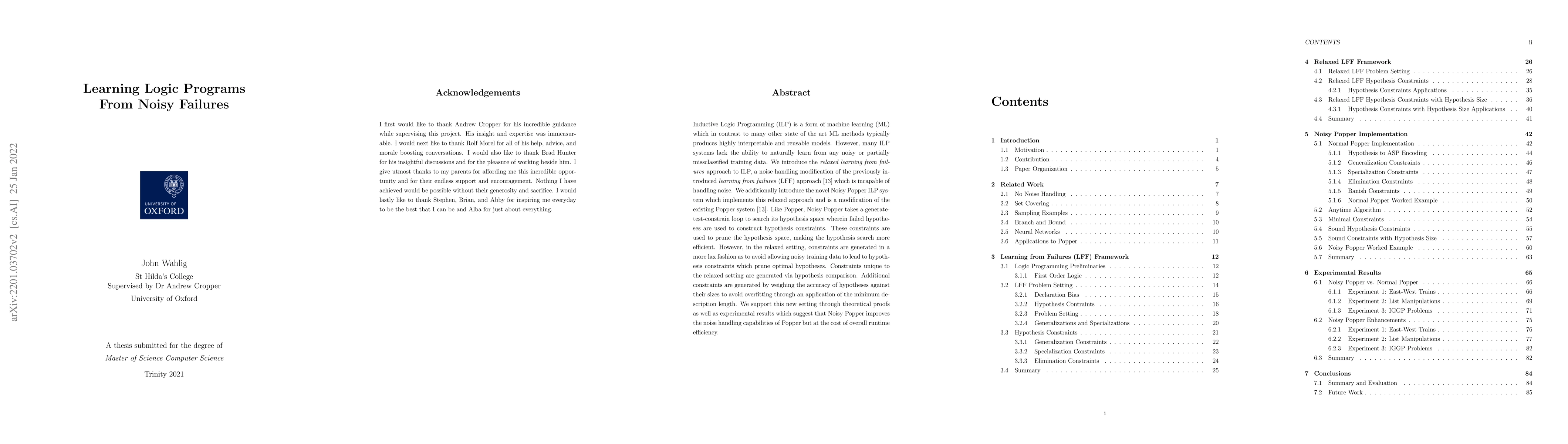 This paper introduces a modified ILP system called Noisy Popper, which enhances the learning from failures approach to handle noisy training data. Unlike the original Popper system, Noisy Popper generates constraints more cautiously to avoid overfitting and ensures optimal hypothesis selection despite noise, supported by theoretical proofs and experimental results.