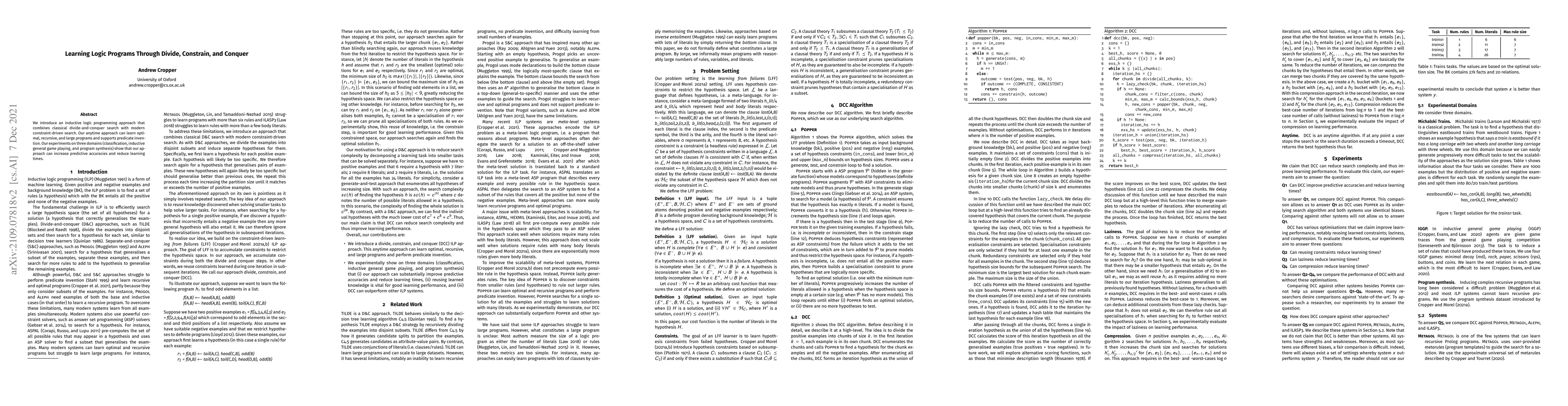 This paper proposes an inductive logic programming method that integrates divide-and-conquer and constraint-driven search, achieving optimal, recursive, and large program learning with predicate invention. Experiments in classification, game playing, and synthesis demonstrate improved accuracy and faster learning times.