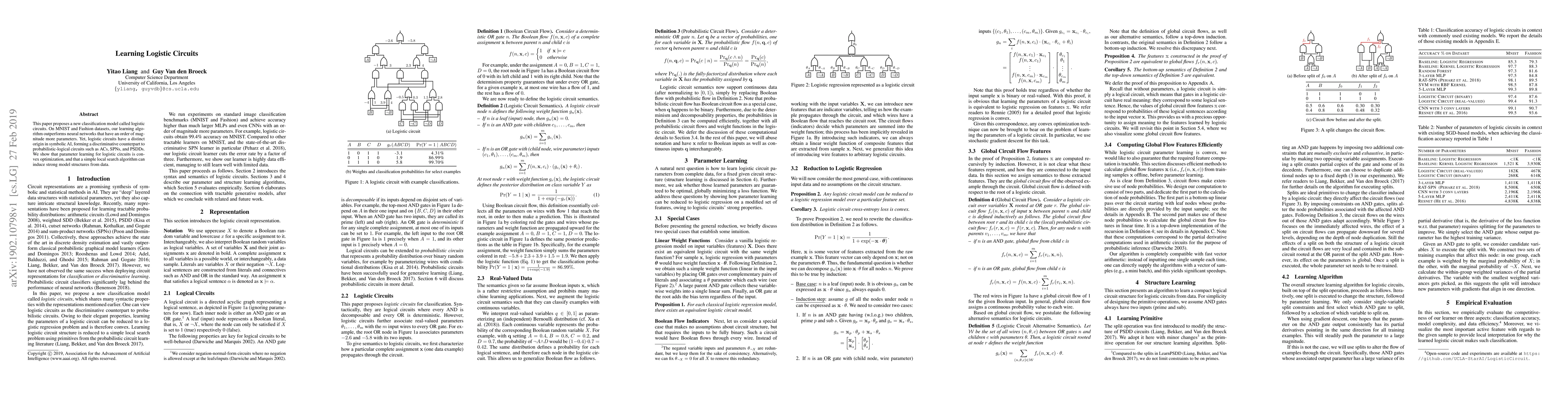 This paper introduces logistic circuits, a novel classification model that surpasses neural networks with more parameters on MNIST and Fashion datasets. The model, rooted in symbolic AI, offers a discriminative alternative to probabilistic-logical circuits, with parameter learning being convex optimization, and simple local search inducing robust model structures from data.