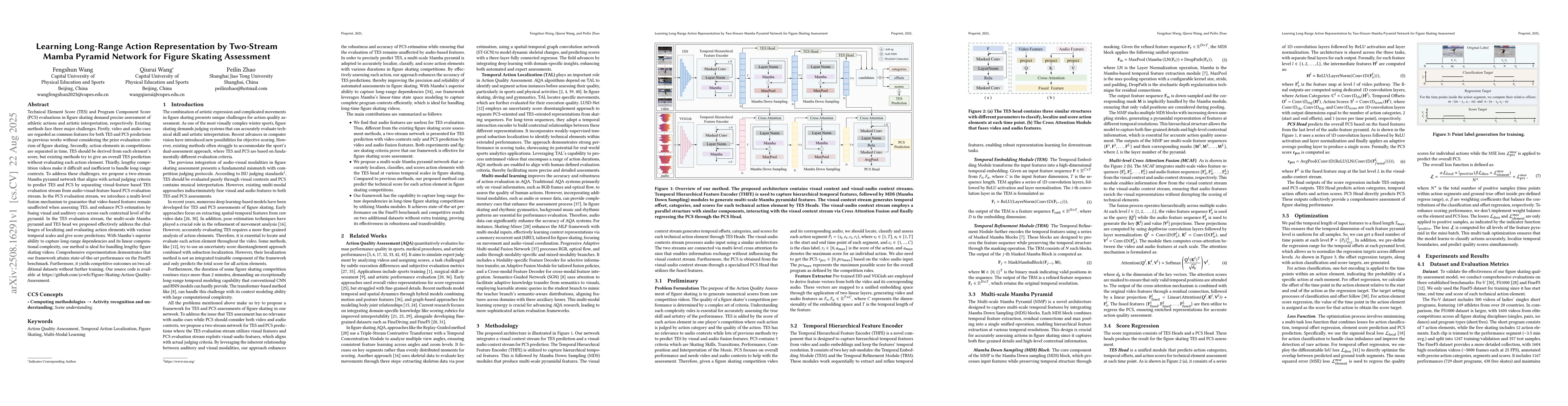 Technical Element Score (TES) and Program Component Score (PCS) evaluations in figure skating demand precise assessment of athletic actions and artistic interpretation, respectively. Existing methods face three major challenges. Firstly, video and audio cues are regarded as common features for both TES and PCS predictions in previous works without considering the prior evaluation criterion of figure skating. Secondly, action elements in competitions are separated in time, TES should be derived from each element's score, but existing methods try to give an overall TES prediction without evaluating each action element. Thirdly, lengthy competition videos make it difficult and inefficient to handle long-range contexts. To address these challenges, we propose a two-stream Mamba pyramid network that aligns with actual judging criteria to predict TES and PCS by separating visual-feature based TES evaluation stream from audio-visual-feature based PCS evaluation stream. In the PCS evaluation stream, we introduce a multi-level fusion mechanism to guarantee that video-based features remain unaffected when assessing TES, and enhance PCS estimation by fusing visual and auditory cues across each contextual level of the pyramid. In the TES evaluation stream, the multi-scale Mamba pyramid and TES head we proposed effectively address the challenges of localizing and evaluating action elements with various temporal scales and give score predictions. With Mamba's superior ability to capture long-range dependencies and its linear computational complexity, our method is ideal for handling lengthy figure skating videos. Comprehensive experimentation demonstrates that our framework attains state-of-the-art performance on the FineFS benchmark. Our source code is available at https://github.com/ycwfs/Figure-Skating-Action-Quality-Assessment.