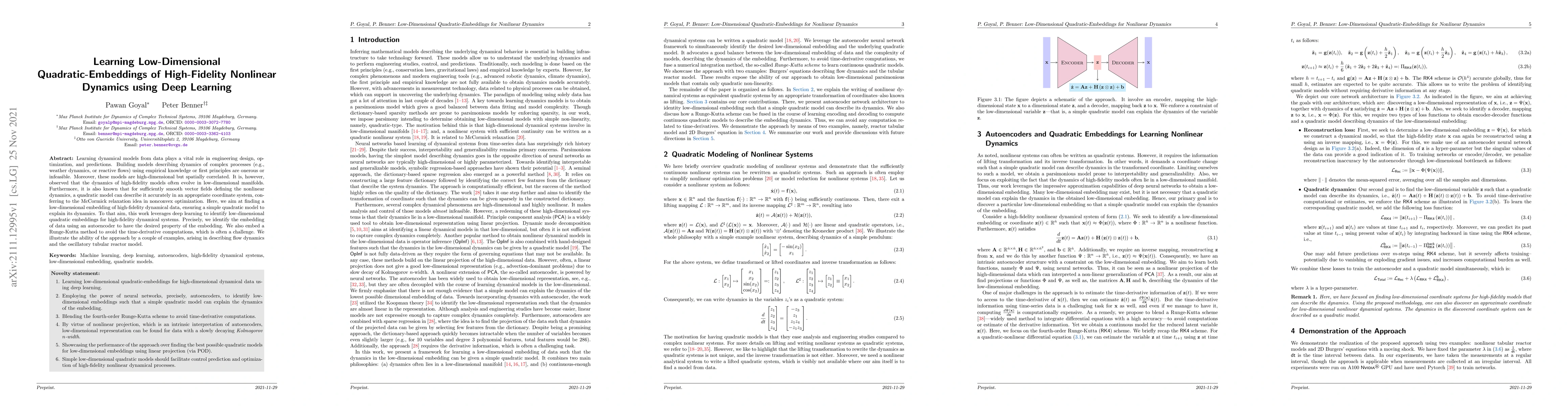 This paper explores using deep learning techniques to identify low-dimensional quadratic embeddings of high-fidelity nonlinear dynamical systems, aiming to simplify complex models through autoencoders and Runge-Kutta methods, thereby facilitating engineering design and optimization. The approach is demonstrated through examples involving flow dynamics and the oscillatory tubular reactor model.